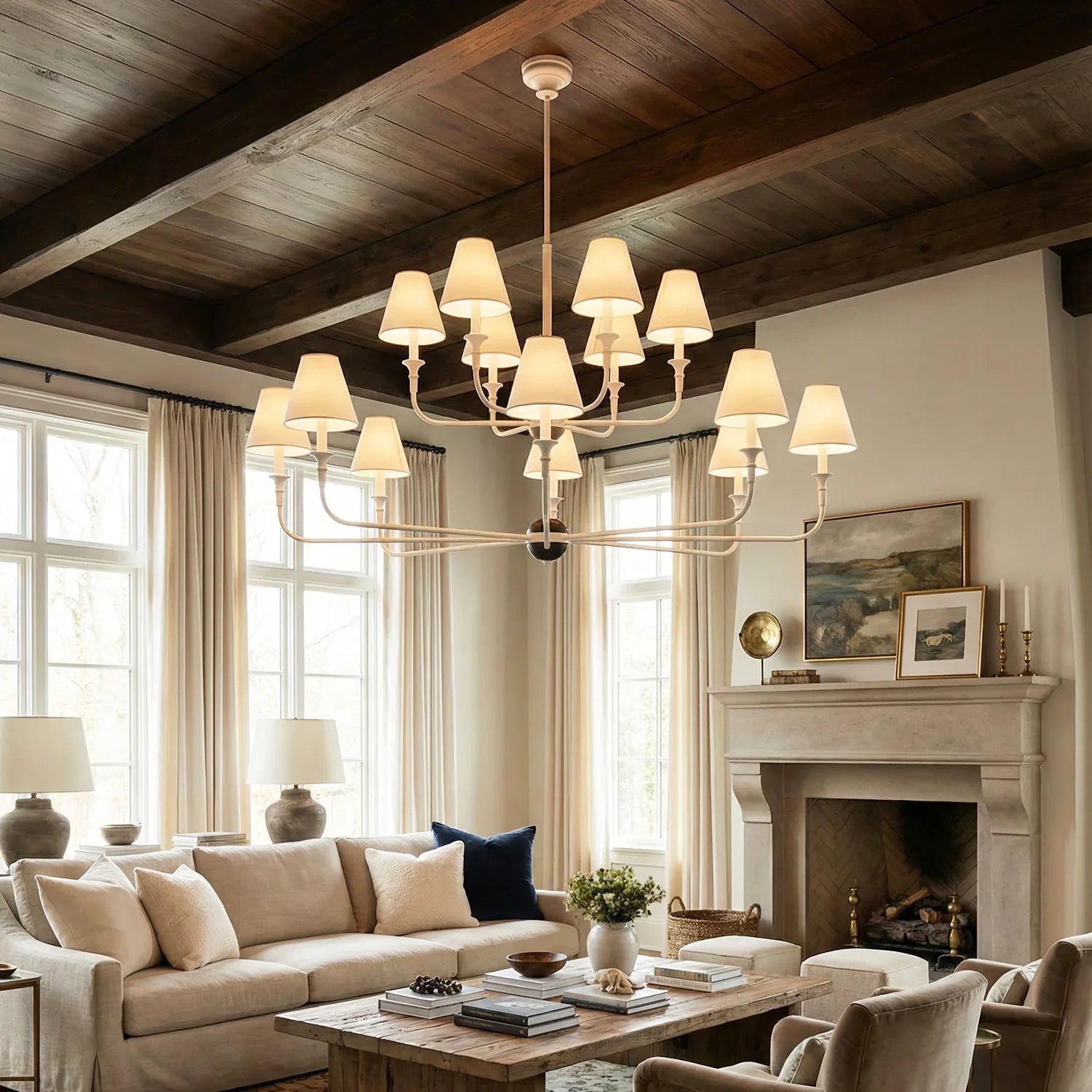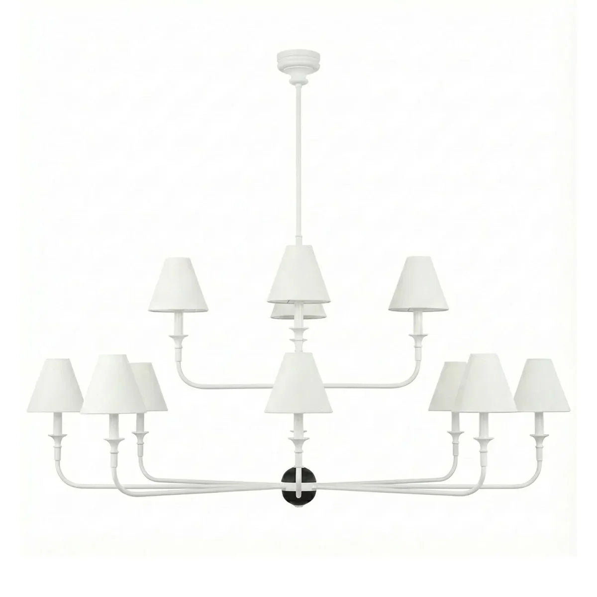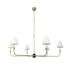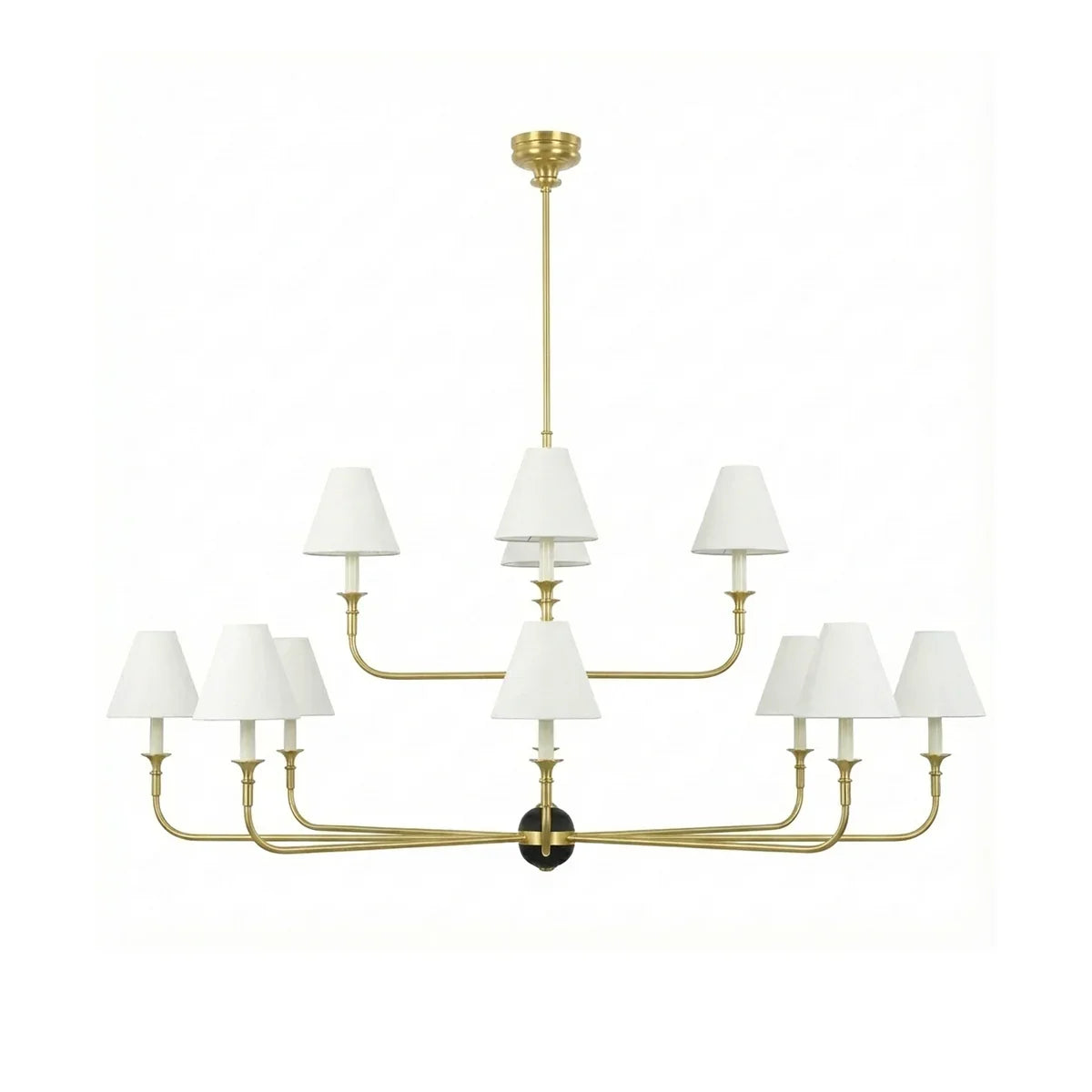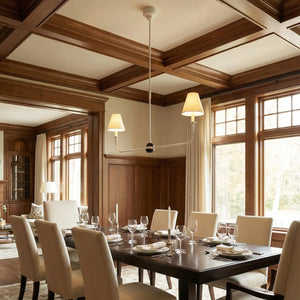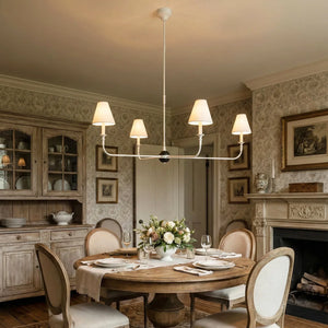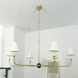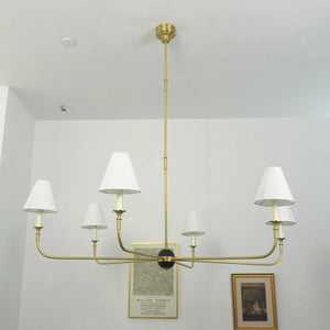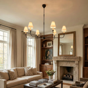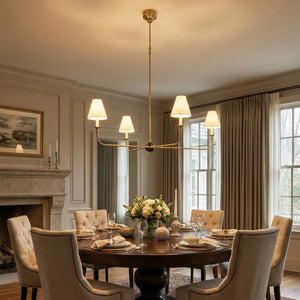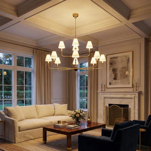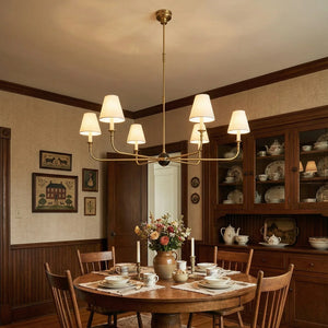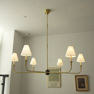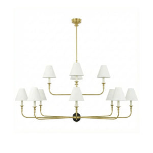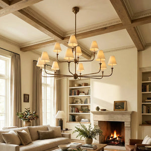 The Grande Multi Arm Conical Chandelier infuses your home with timeless elegance and high-end sophistication. More than just a lighting fixture, it's a refined interpretation of classic aesthetics and modern lifestyles. It serves as a visual focal point in dining rooms, living rooms, or commercial spaces, perfectly complementing French or American modern interior design. It boasts both strong decorative appeal and functionality. The contrast between the fabric lampshades and the copper frame creates a serene yet luxurious overall atmosphere when lit, effectively eliminating any sense of coldness in the space.