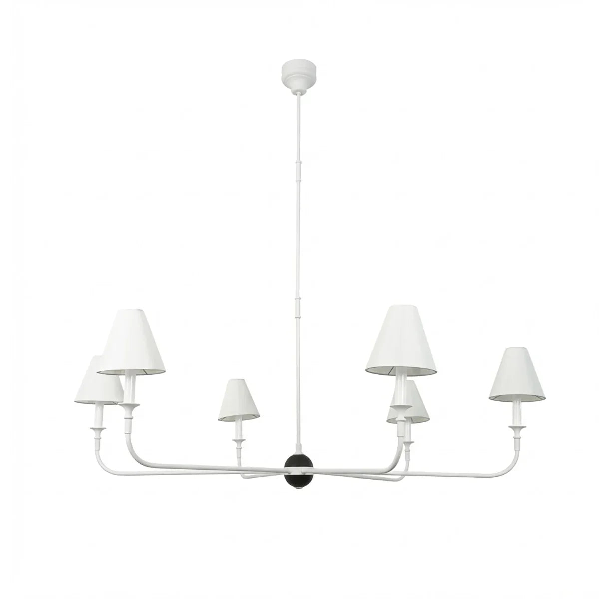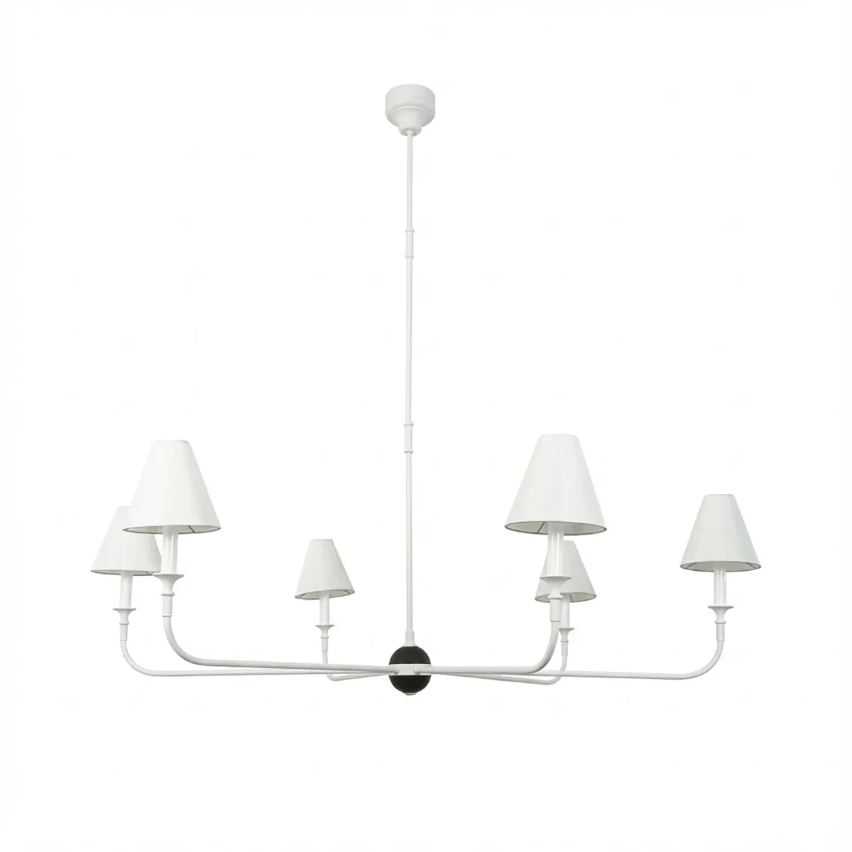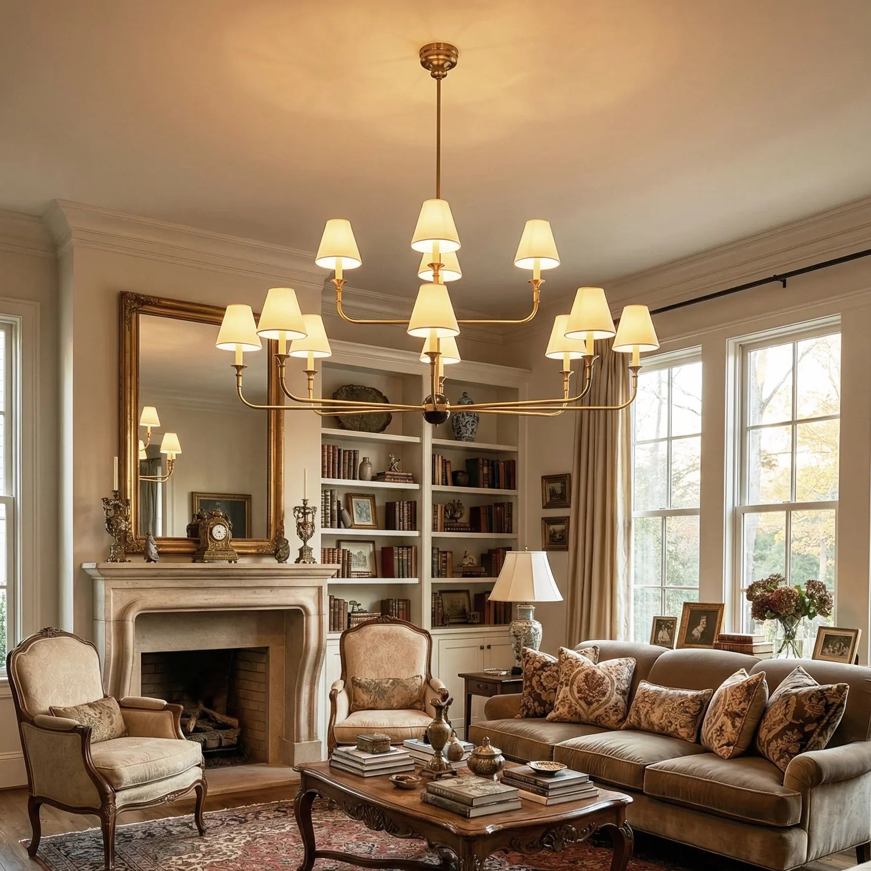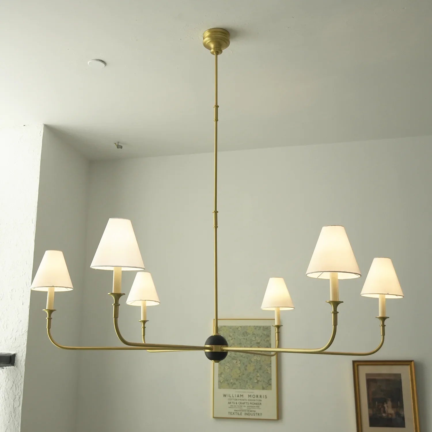 The Grande Multi Arm Conical Chandelier infuses your home with timeless elegance and high-end sophistication. More than just a lighting fixture, it's a refined interpretation of classic aesthetics and modern lifestyles. It serves as a visual focal point in dining rooms, living rooms, or commercial spaces, perfectly complementing French or American modern interior design. It boasts both strong decorative appeal and functionality. The contrast between the fabric lampshades and the copper frame creates a serene yet luxurious overall atmosphere when lit, effectively eliminating any sense of coldness in the space.