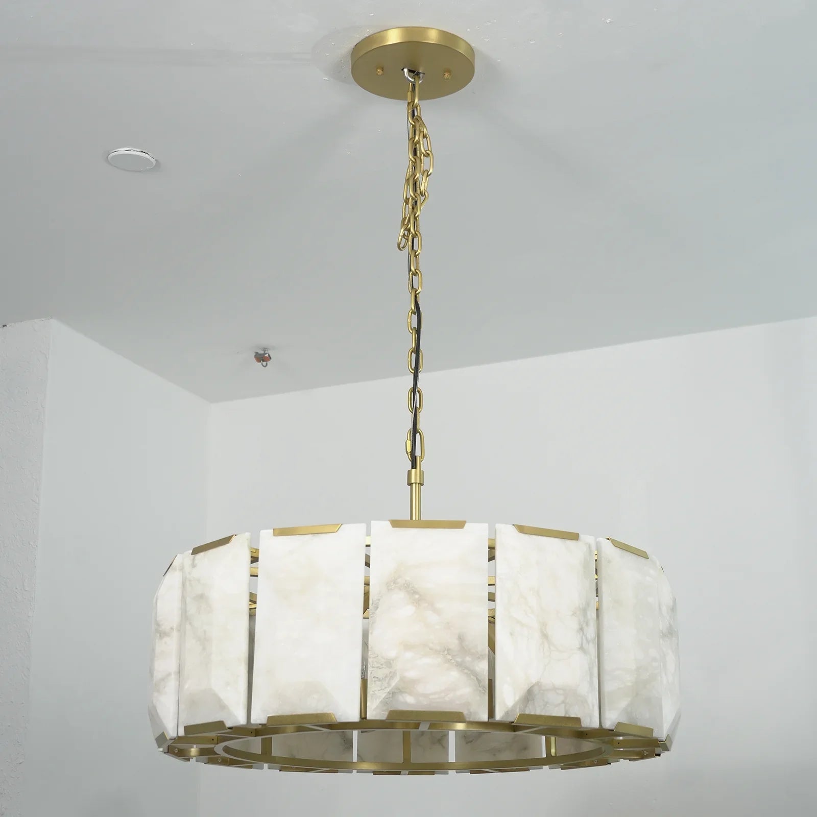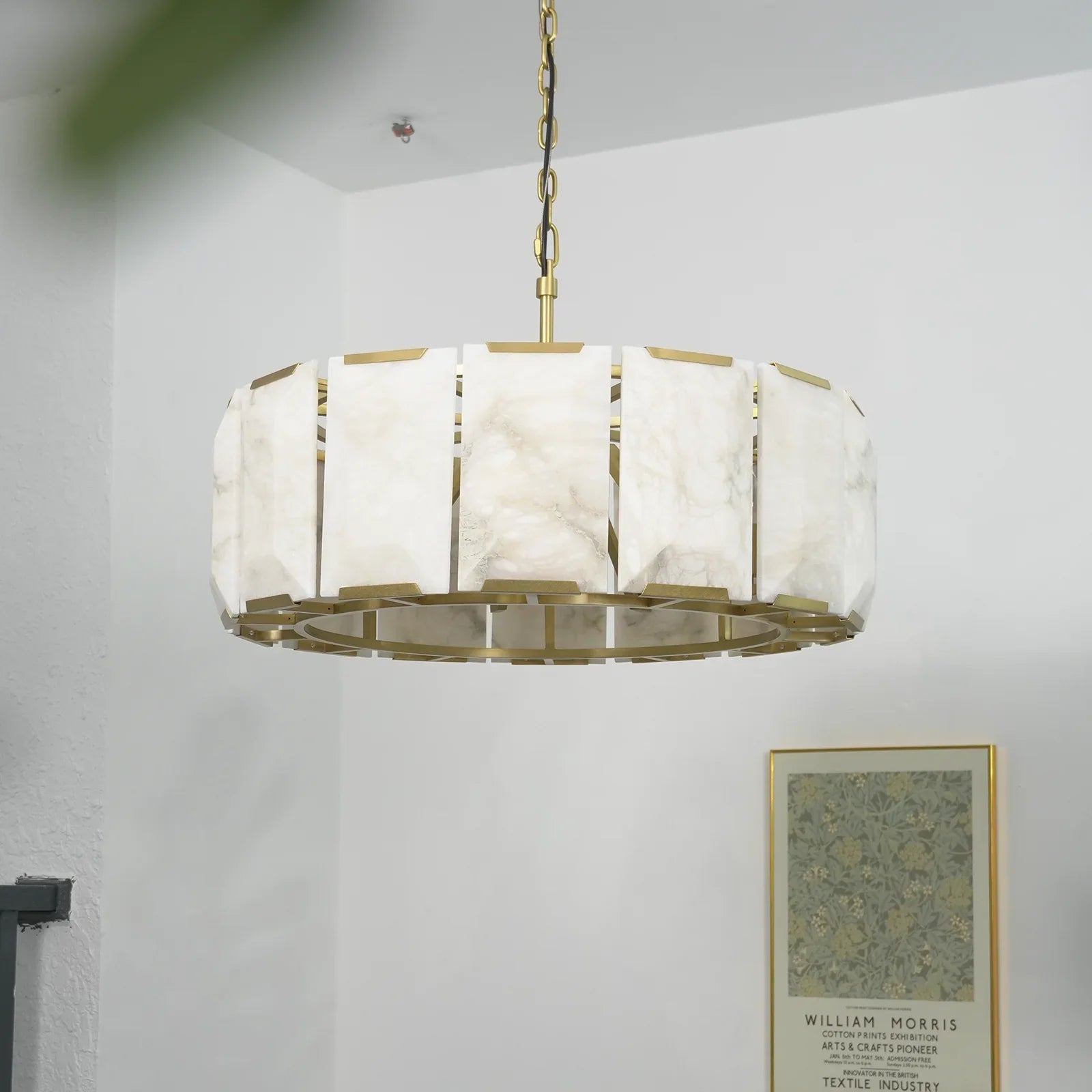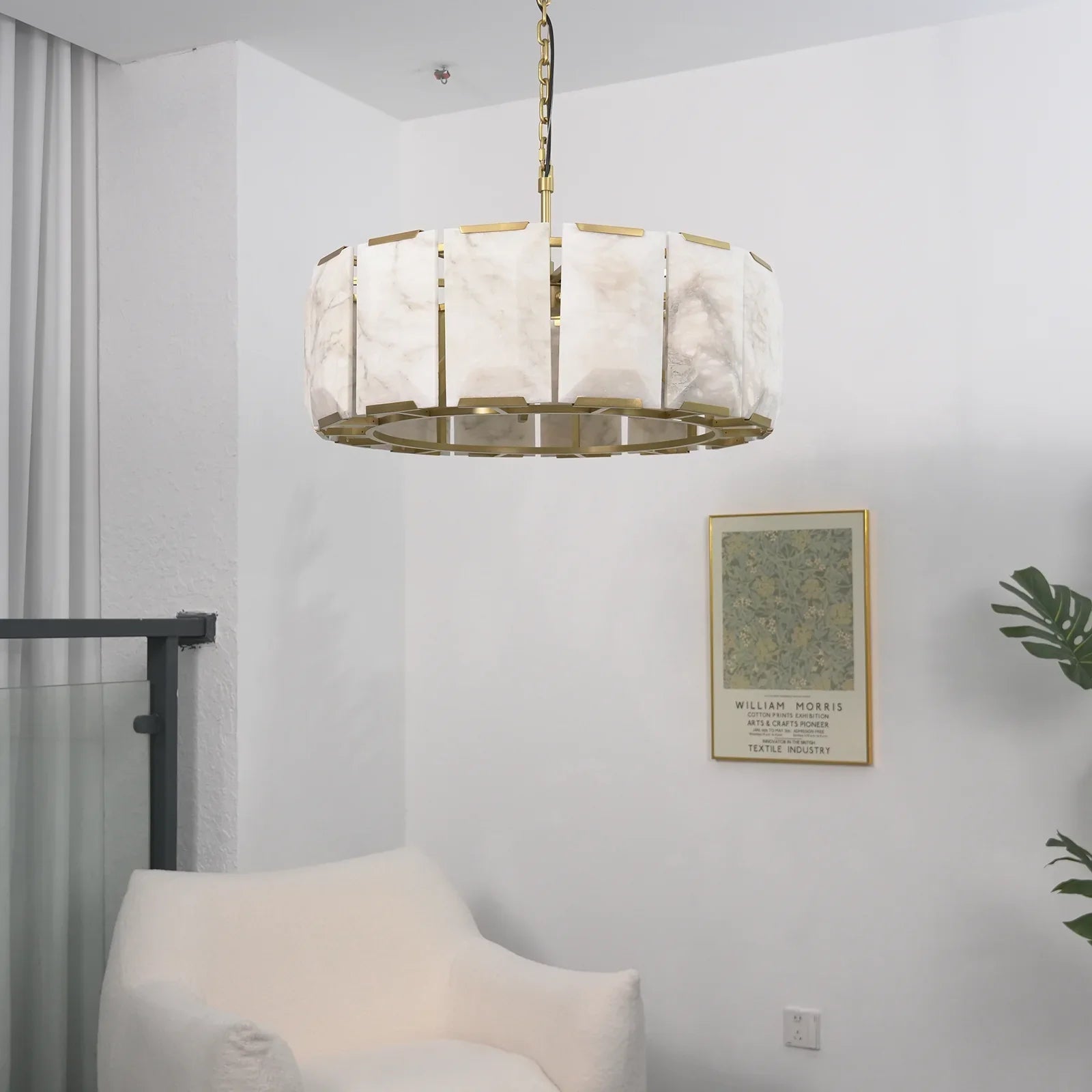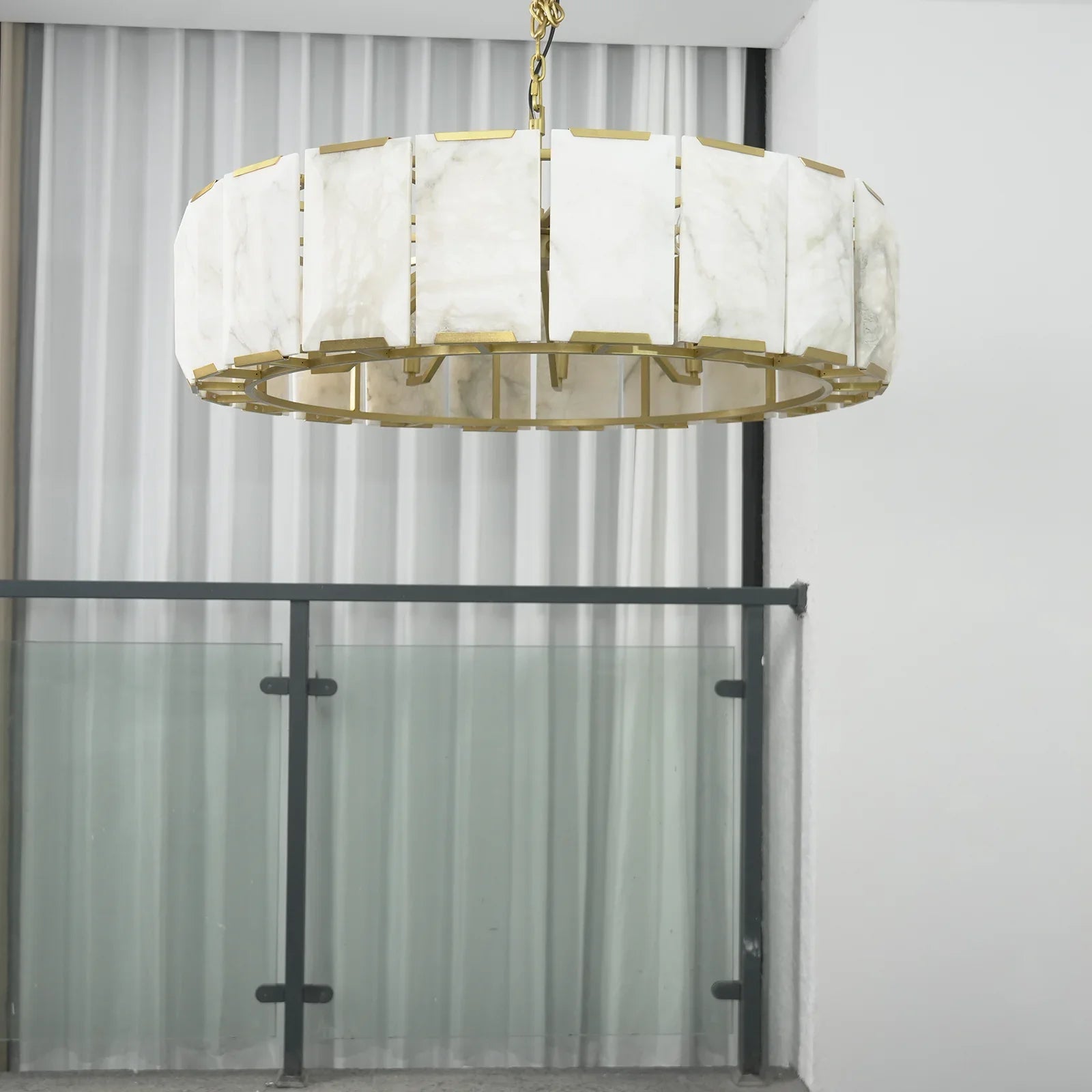 Crafted from high-quality natural alabaster and pure brass, each alabaster panel features a unique texture. The stone exhibits a distinctive crystalline pattern and translucence, complementing the substantial brass base. Its sophisticated minimalist design adds timeless charm to any space. The neatly arranged alabaster panels form a stable circular silhouette, showcasing a subtle yet luxurious modern aesthetic. Utilizing the natural light-diffusing properties of alabaster, the chandelier emits an incredibly soft and even warm light, effectively eliminating harsh shadows and creating a warm and inviting atmosphere.