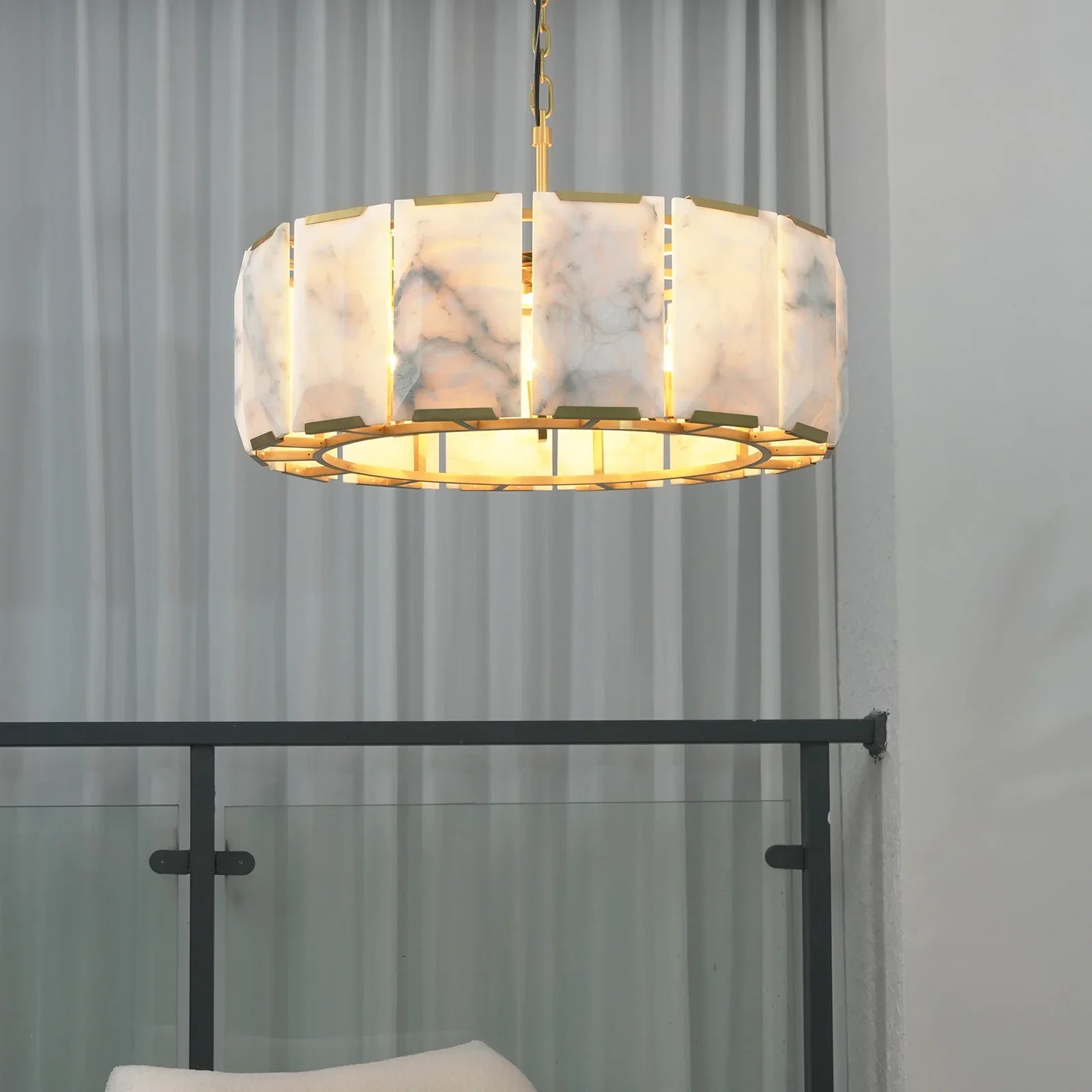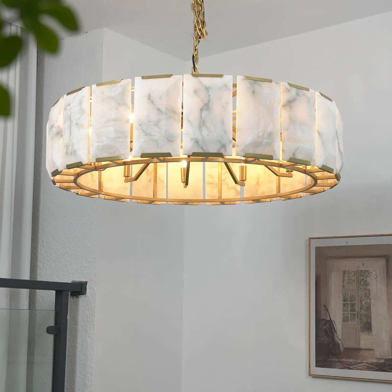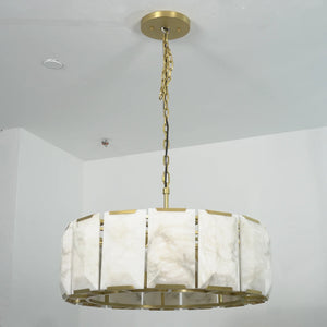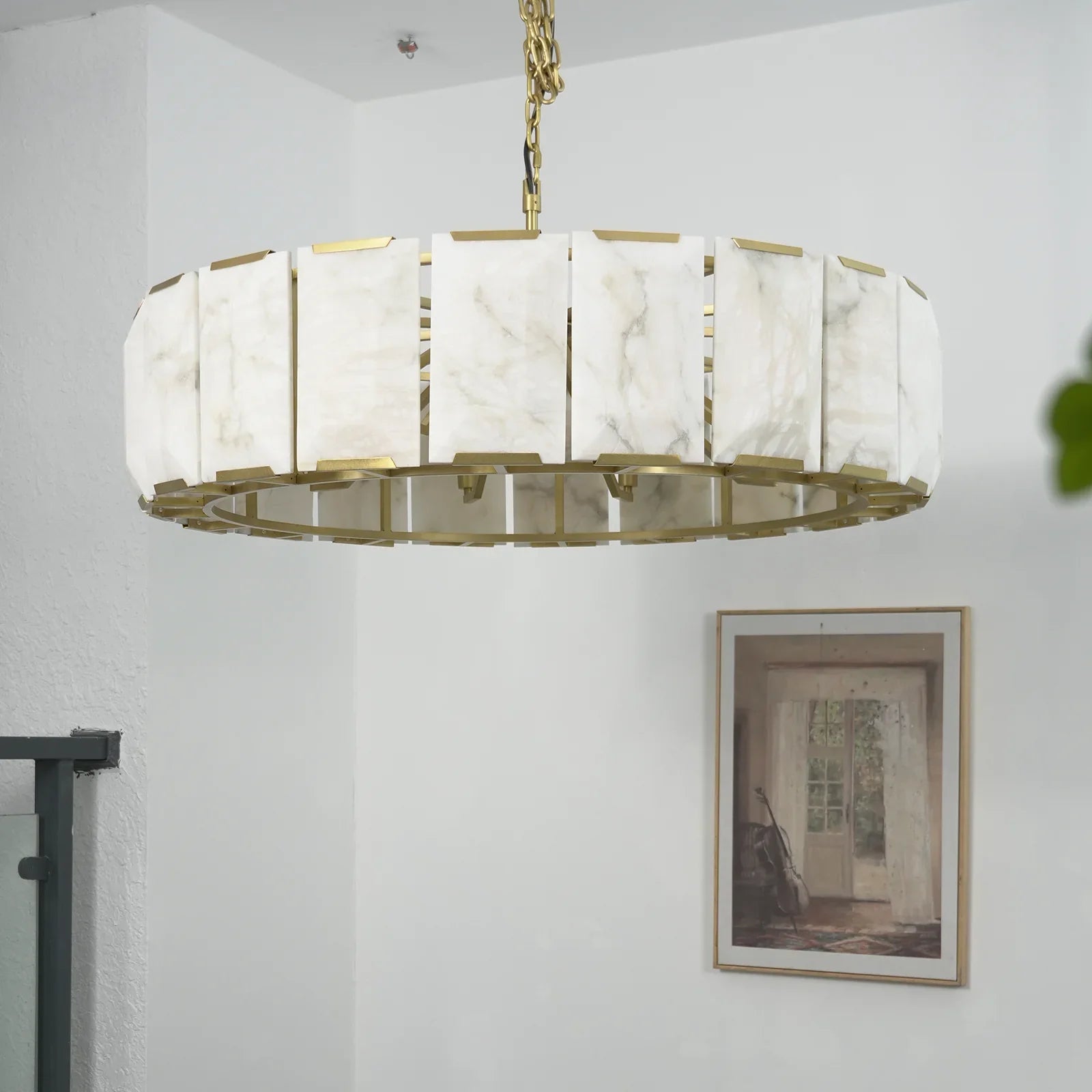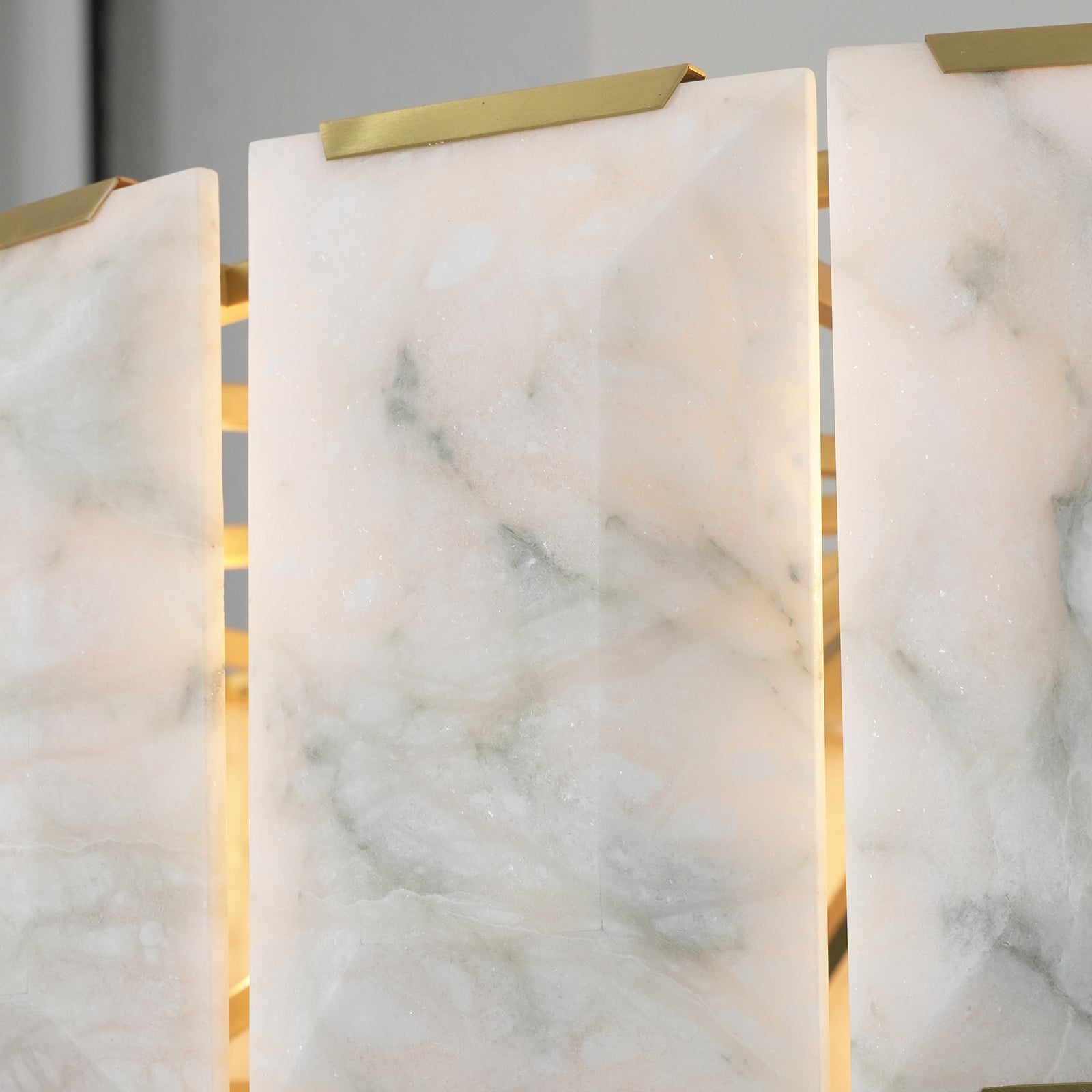 Crafted from high-quality natural alabaster and pure brass, each alabaster panel features a unique texture. The stone exhibits a distinctive crystalline pattern and translucence, complementing the substantial brass base. Its sophisticated minimalist design adds timeless charm to any space. The neatly arranged alabaster panels form a stable circular silhouette, showcasing a subtle yet luxurious modern aesthetic. Utilizing the natural light-diffusing properties of alabaster, the chandelier emits an incredibly soft and even warm light, effectively eliminating harsh shadows and creating a warm and inviting atmosphere.
