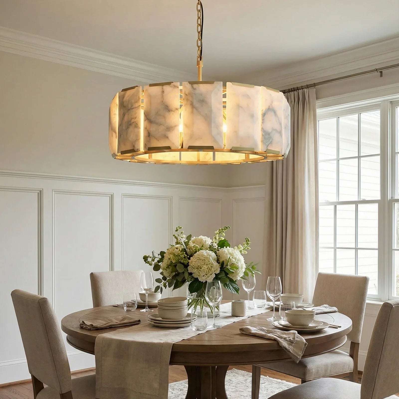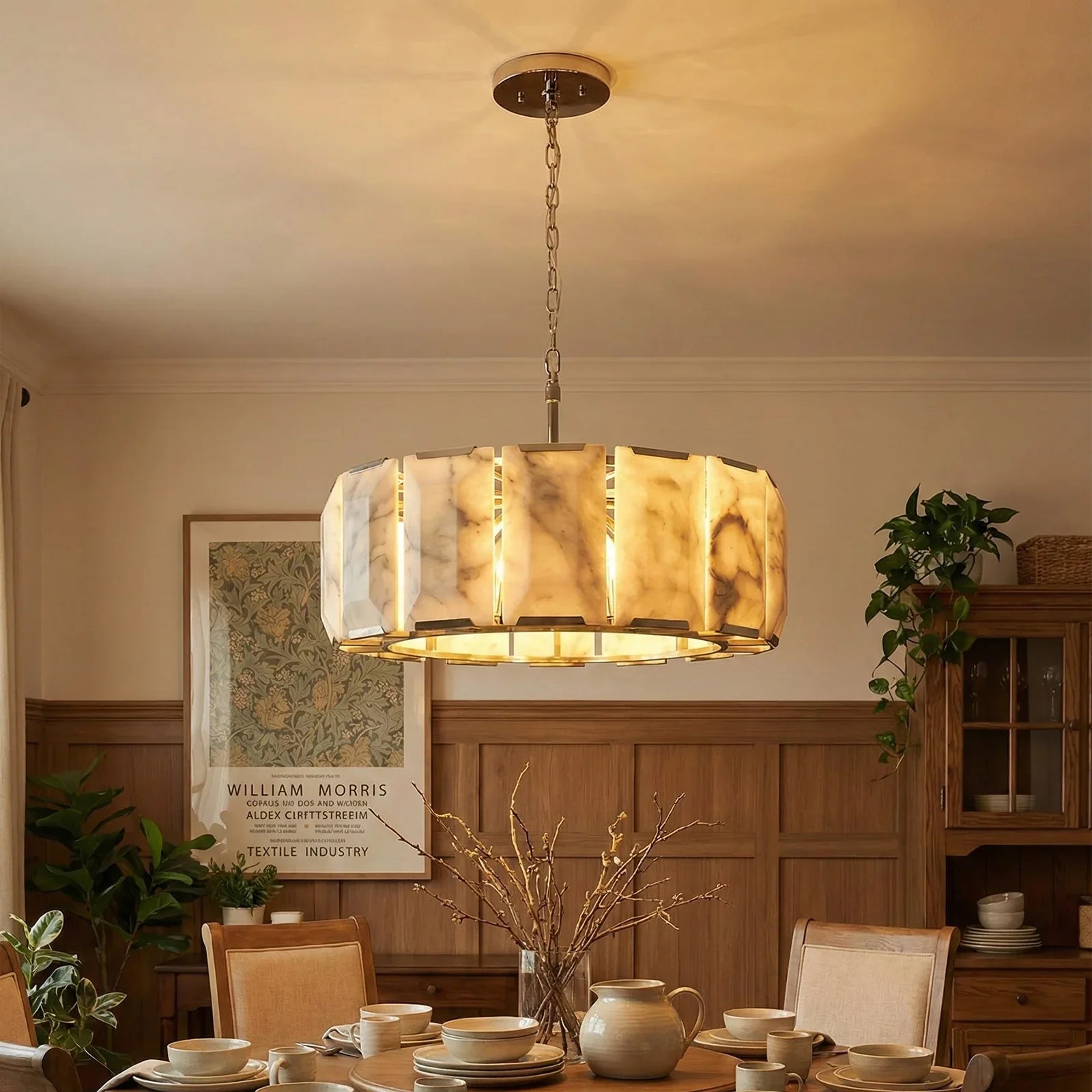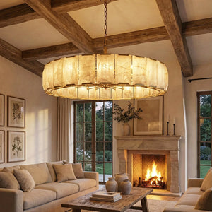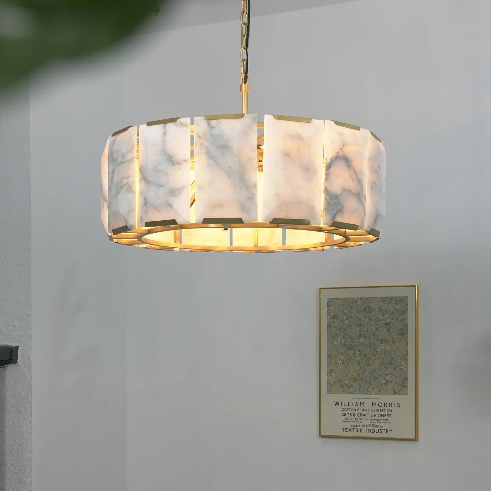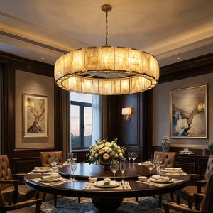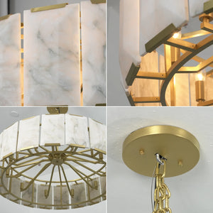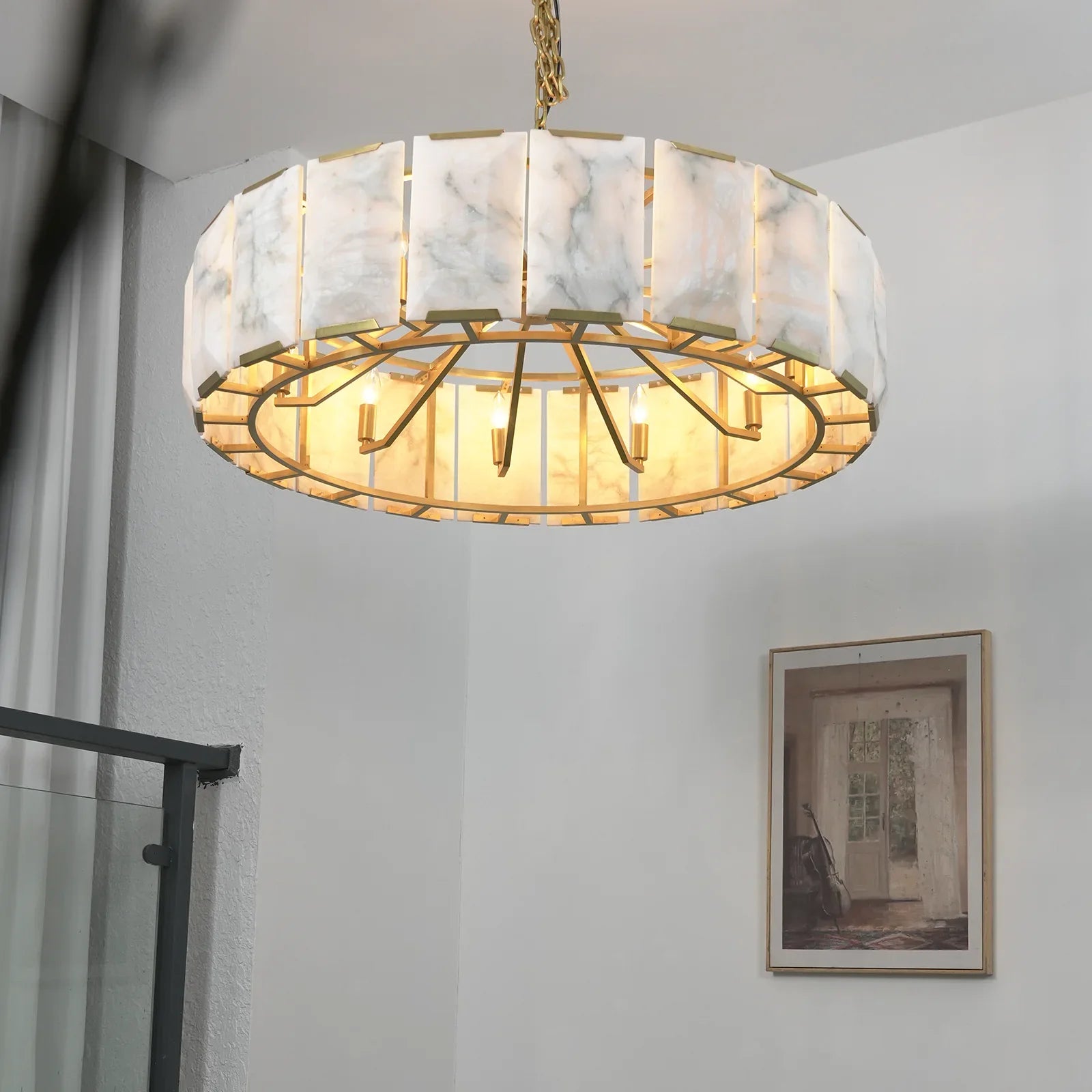 Crafted from high-quality natural alabaster and pure brass, each alabaster panel features a unique texture. The stone exhibits a distinctive crystalline pattern and translucence, complementing the substantial brass base. Its sophisticated minimalist design adds timeless charm to any space. The neatly arranged alabaster panels form a stable circular silhouette, showcasing a subtle yet luxurious modern aesthetic. Utilizing the natural light-diffusing properties of alabaster, the chandelier emits an incredibly soft and even warm light, effectively eliminating harsh shadows and creating a warm and inviting atmosphere.