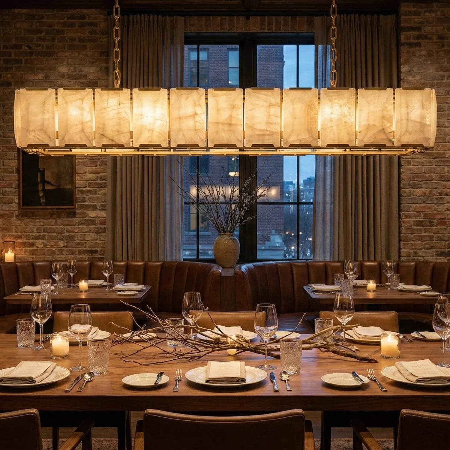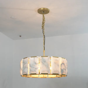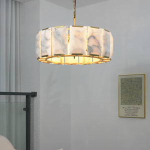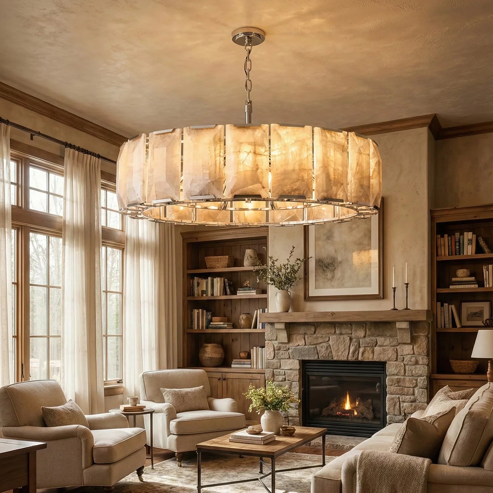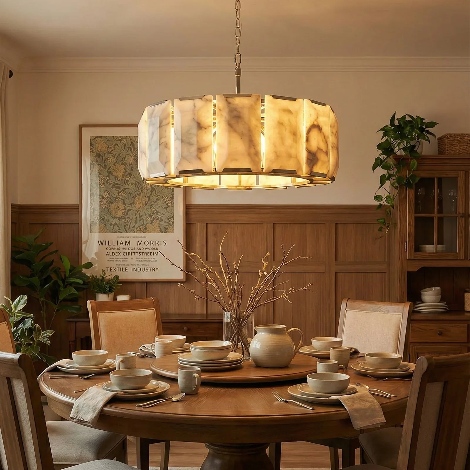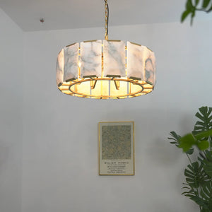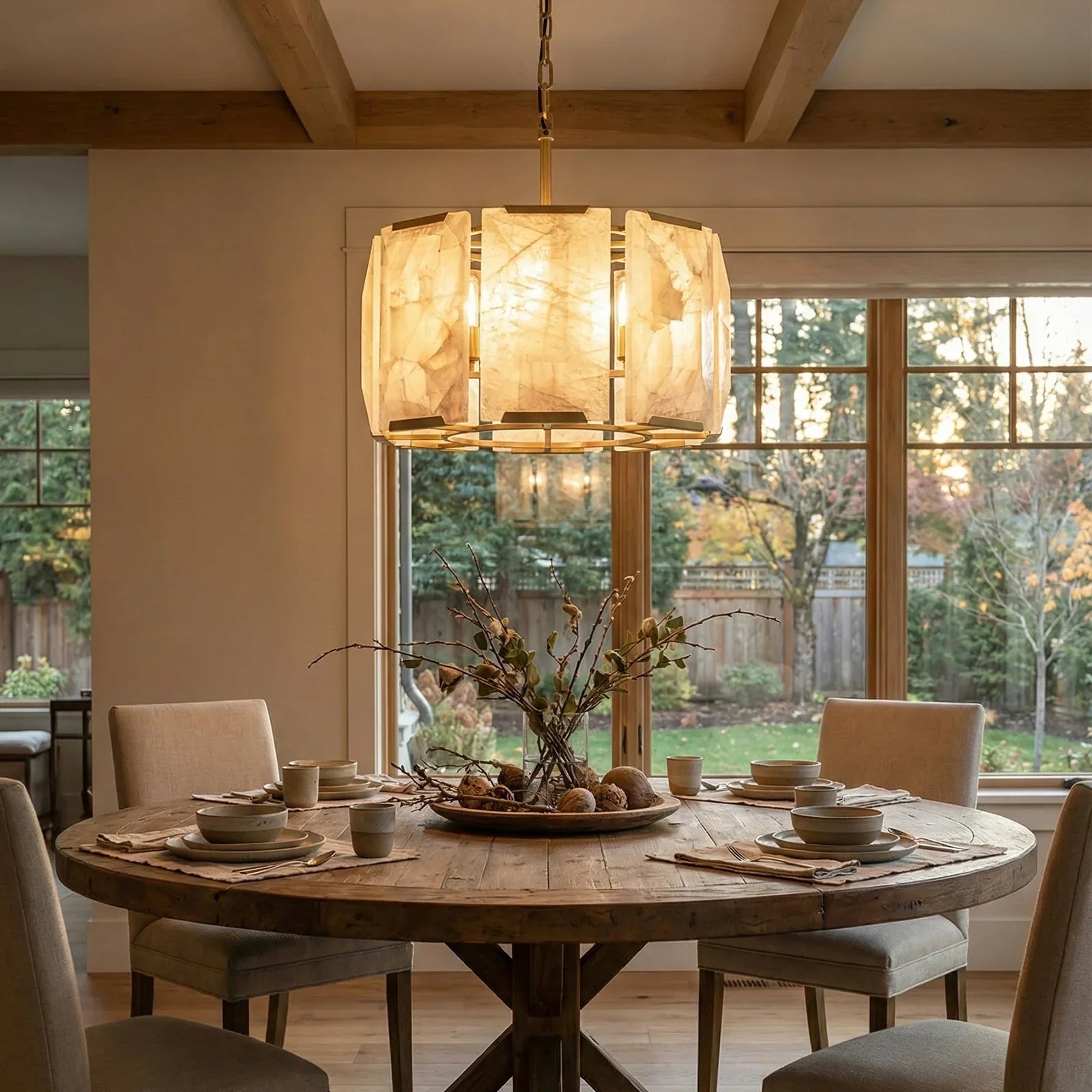 Crafted from high-quality natural alabaster and pure brass, each alabaster panel features a unique texture. The stone exhibits a distinctive crystalline pattern and translucence, complementing the substantial brass base. Its sophisticated minimalist design adds timeless charm to any space. The neatly arranged alabaster panels form a stable circular silhouette, showcasing a subtle yet luxurious modern aesthetic. Utilizing the natural light-diffusing properties of alabaster, the chandelier emits an incredibly soft and even warm light, effectively eliminating harsh shadows and creating a warm and inviting atmosphere.