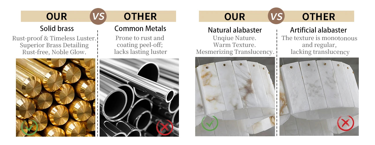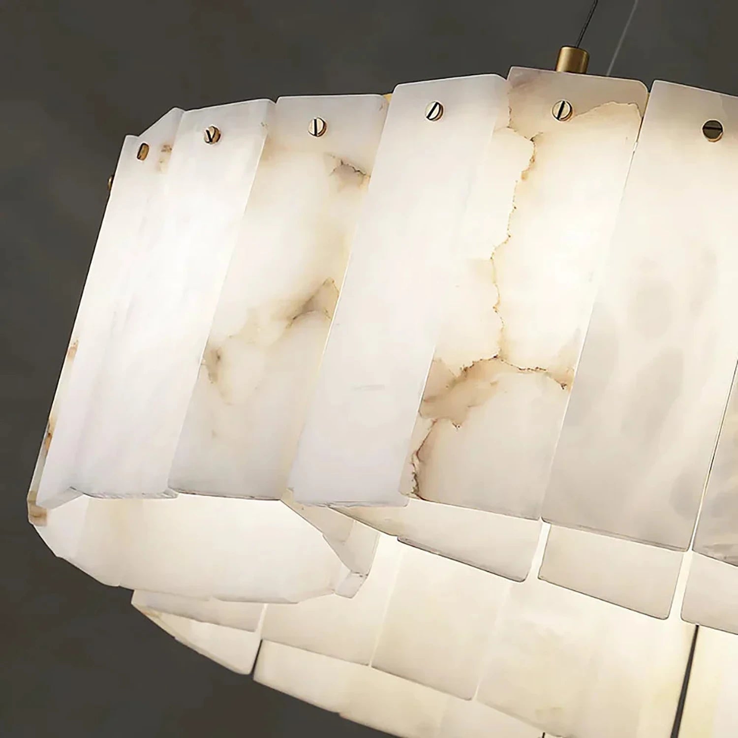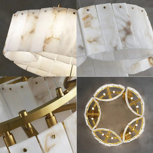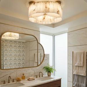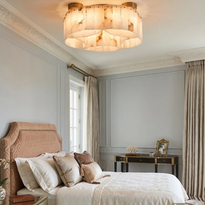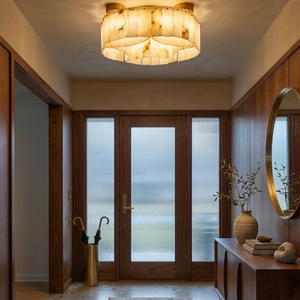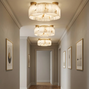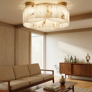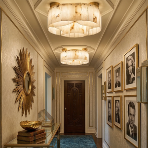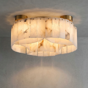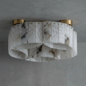 This Alabaster Modern Brass Ceiling Lamp is the ultimate statement piece, seamlessly blending organic natural materials with refined metal craftsmanship. Crafted from genuine, hand-selected alabaster stone, each lamp features unique veining, ensuring that your lighting fixture is a one-of-a-kind work of art. The cascading, tiered rectangular stone panels create a sophisticated Art Deco-inspired silhouette that adds a touch of mid-century modern glamour to any interior.