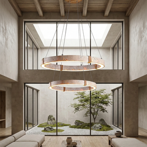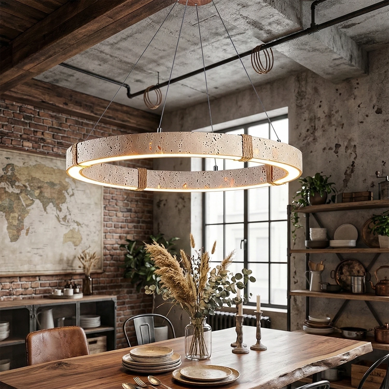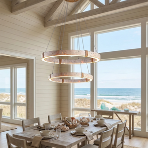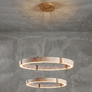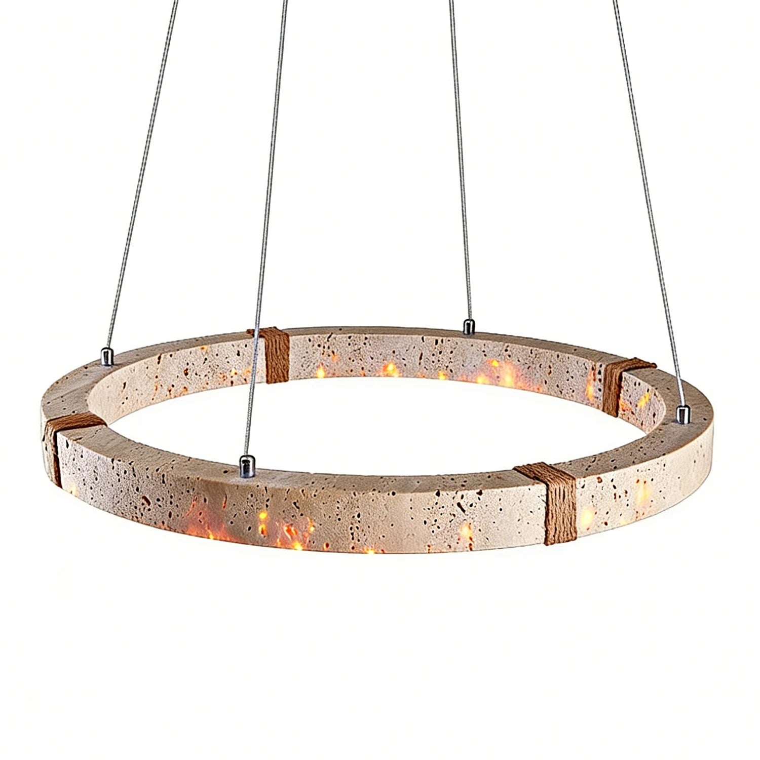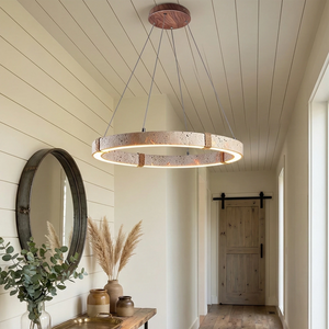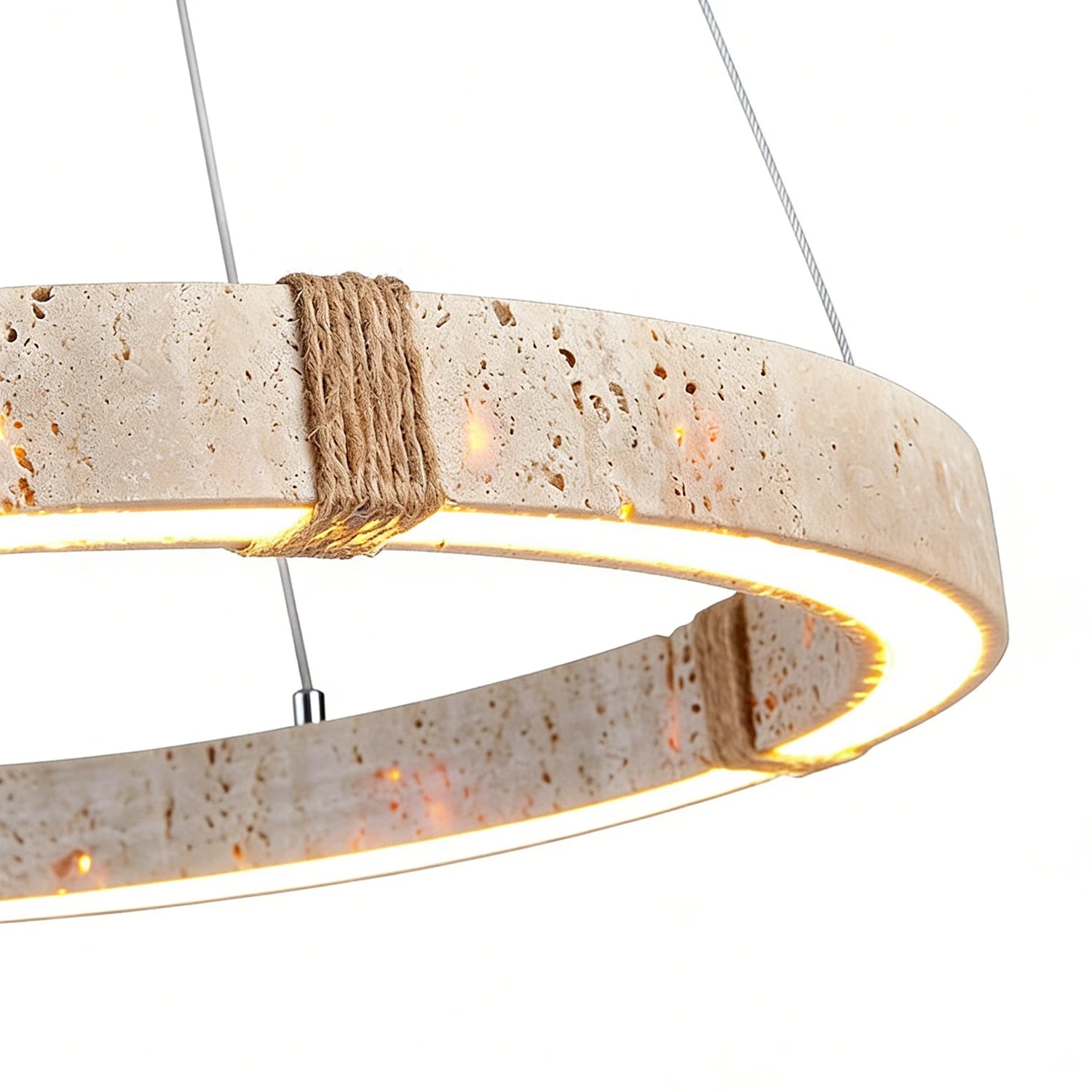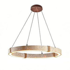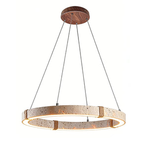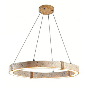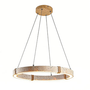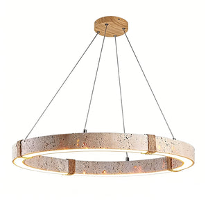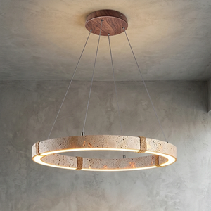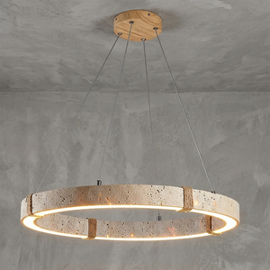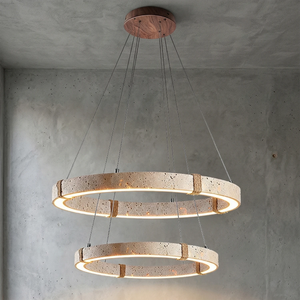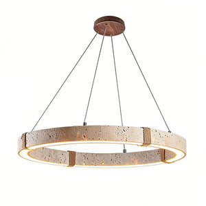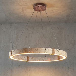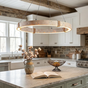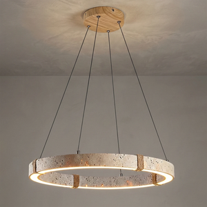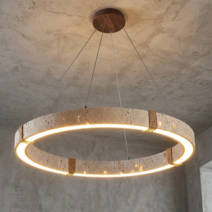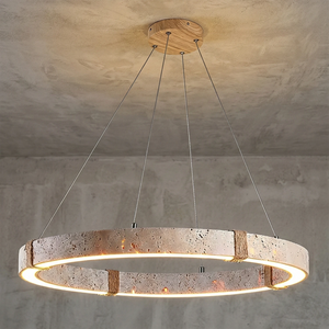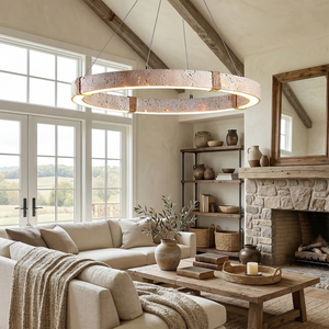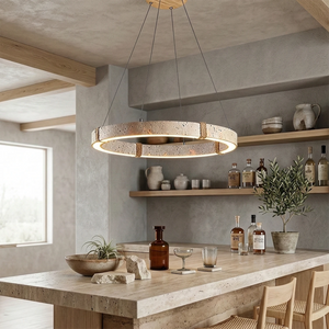 The Ringor Minimalist Round Travertine Chandelier by Nine Lighting combines natural elegance with functional LED technology. Crafted from authentic travertine stone and accented with hand-woven hemp rope, this minimalist chandelier is the perfect centerpiece for Organic Modern, Japandi, and Wabi-Sabi interiors.