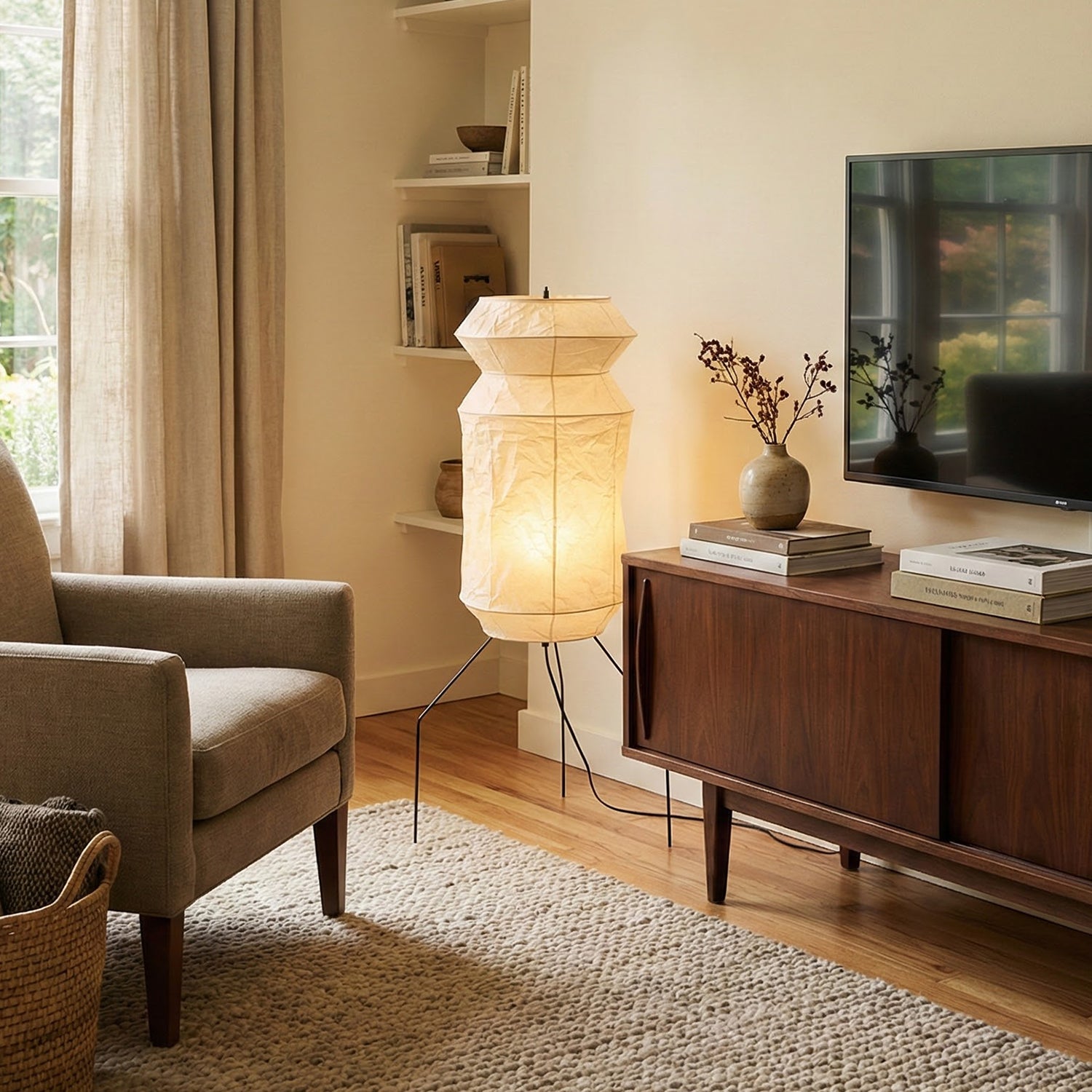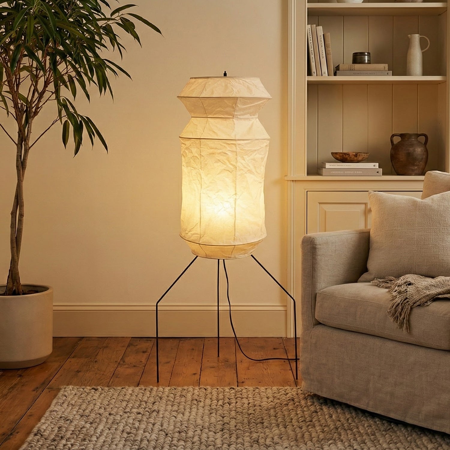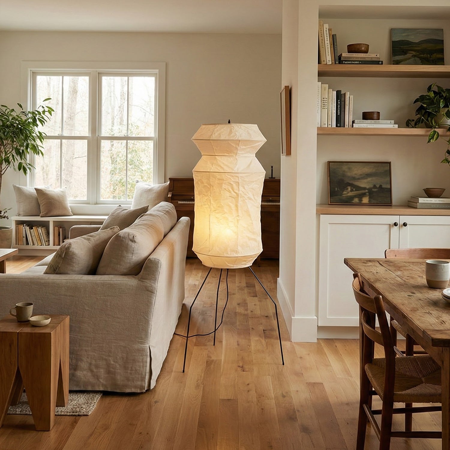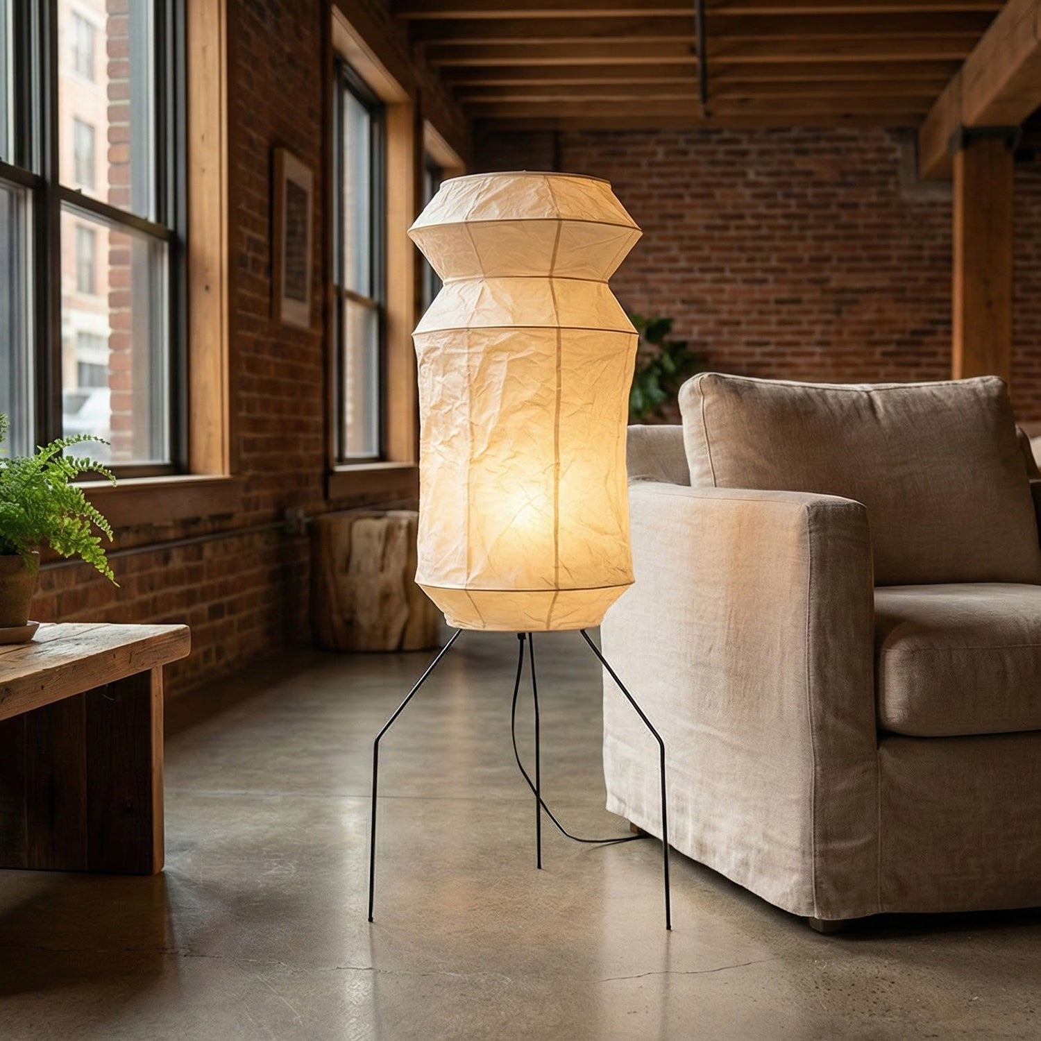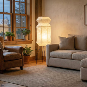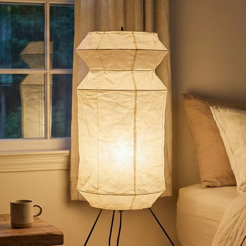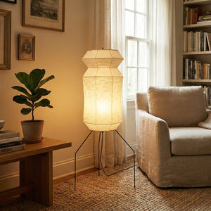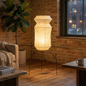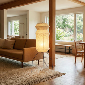 The Lantern Hourglass Paper UF3-L6 Floor Lamp introduces elegance and luxury to your space. Perfectly suited for those seeking tranquility and a refined interior design, it's the perfect finishing touch for Wabi-Sabi style homes. With its tall silhouette, it's ideal for placement in a sofa corner, next to a floor-to-ceiling window, or in a meditation space, acting as a visual focal point. The ribbed structure of the paper surface creates captivating linear projections when illuminated, adding depth and dimension to the space.
