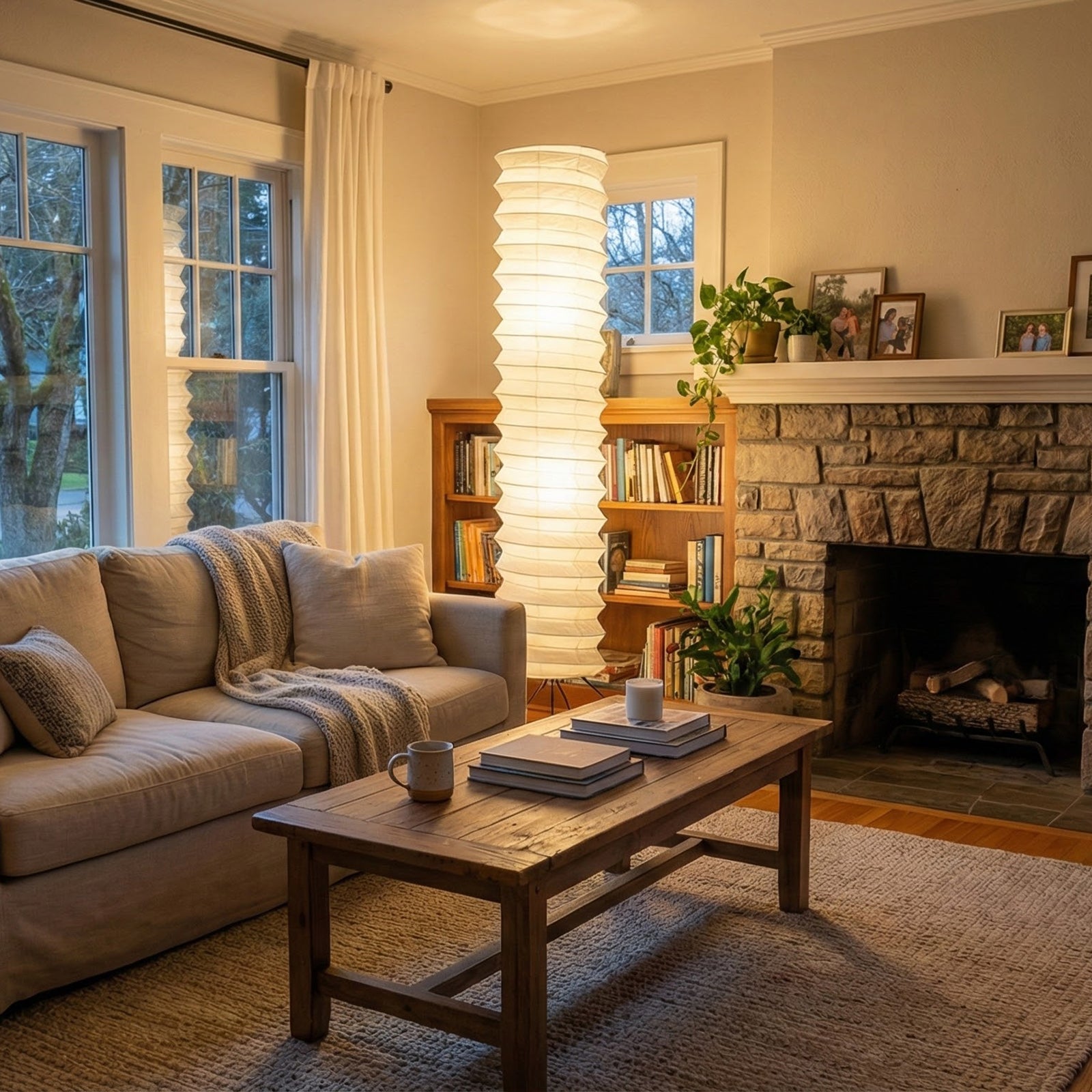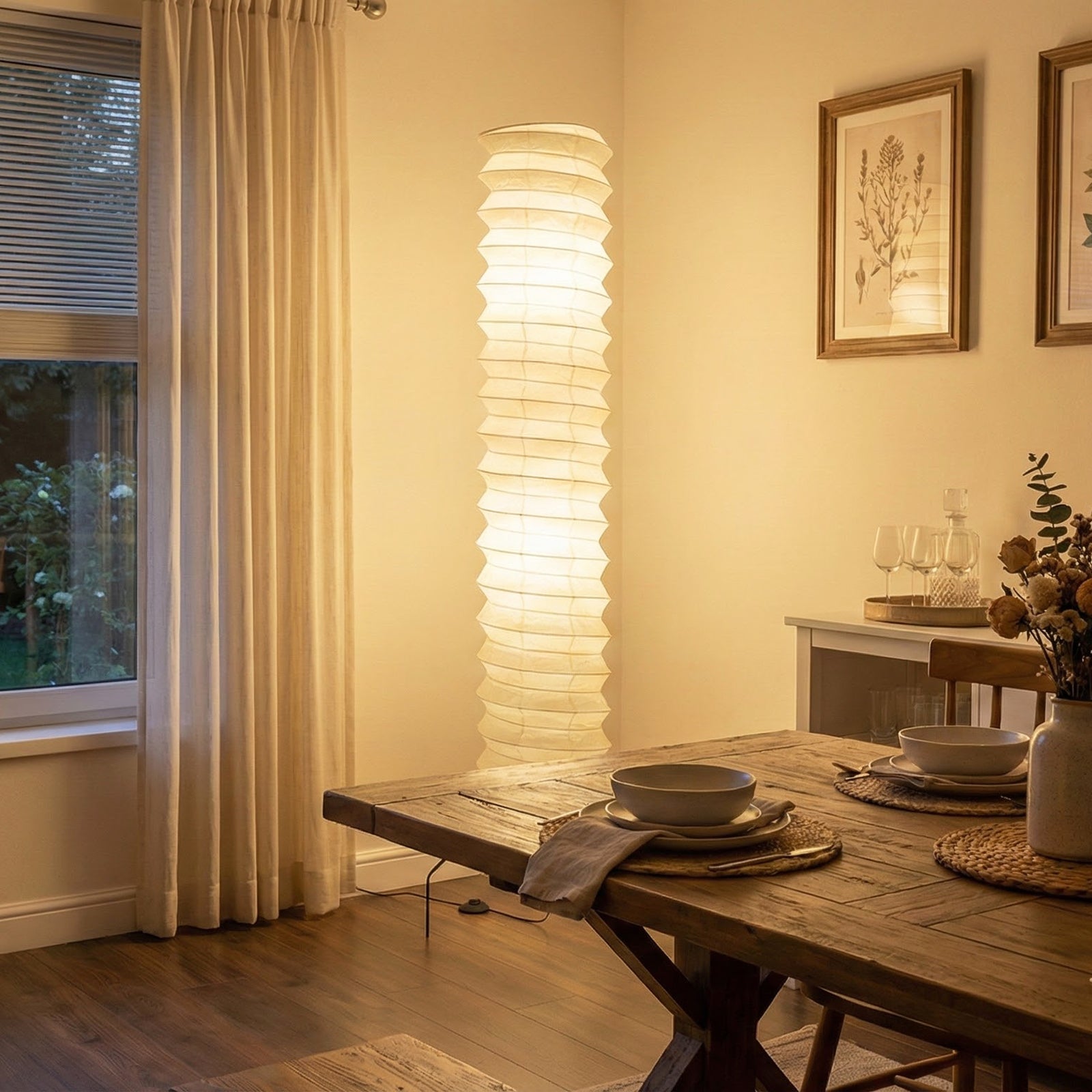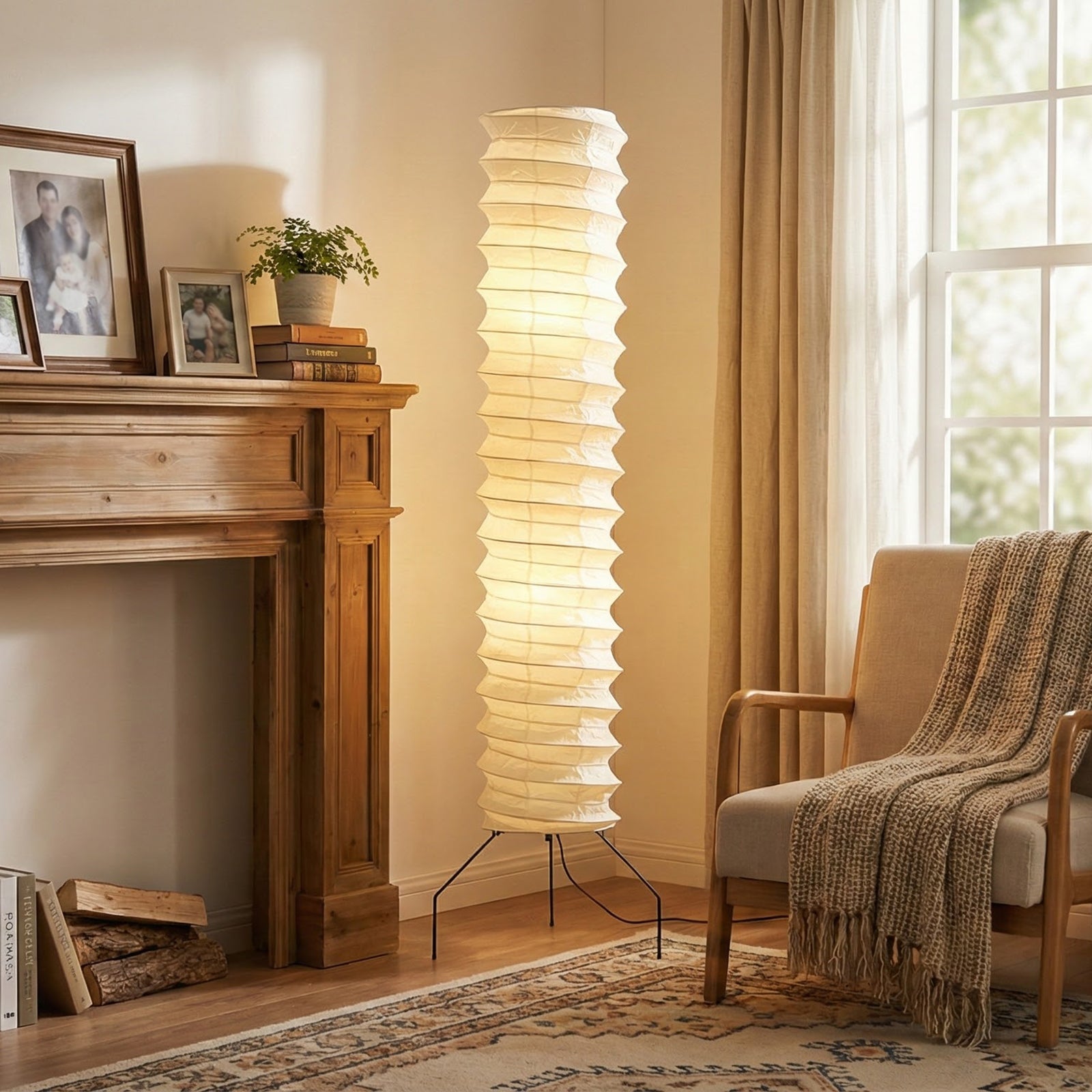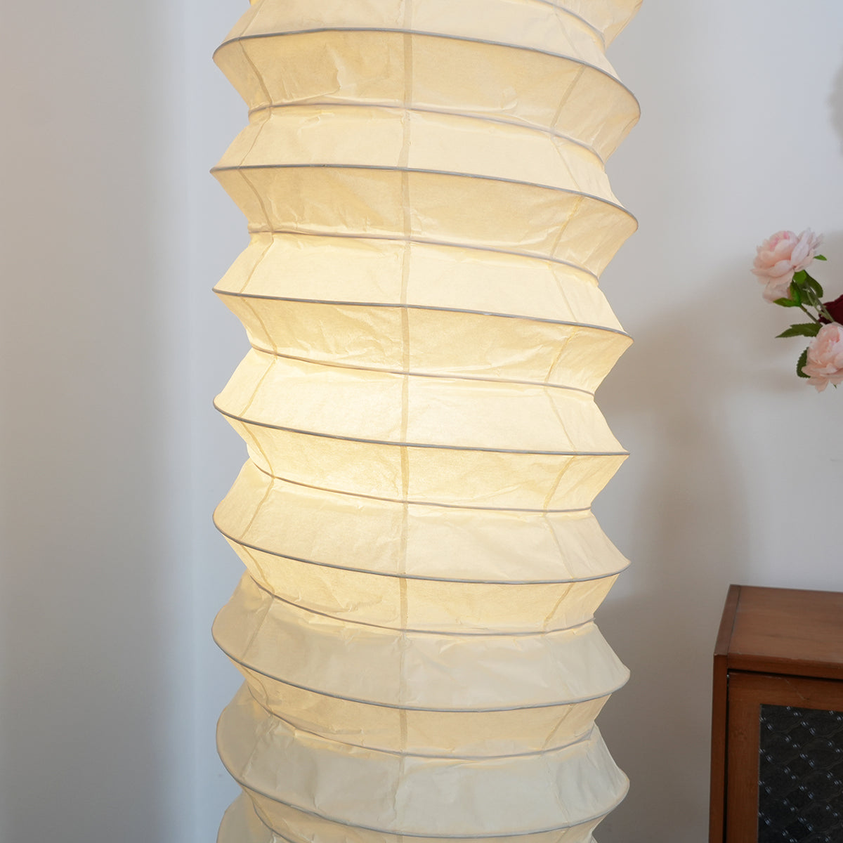 The lamp features a unique, rounded silhouette and a spiraling form, offering a distinctive yet soft illumination. This spiral structure gives it a powerful artistic presence in any space. The lampshade is meticulously crafted from high-quality paper, a natural material that emits a warm glow. Its classic form and material will enhance the traditional beauty of any room. It perfectly blends the essence of Japanese aesthetics and Wabi-sabi philosophy, bringing a sense of minimalist, tranquil sophistication.