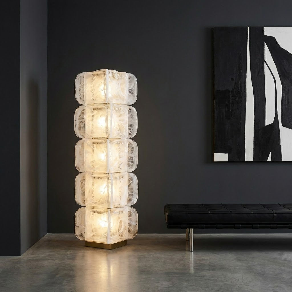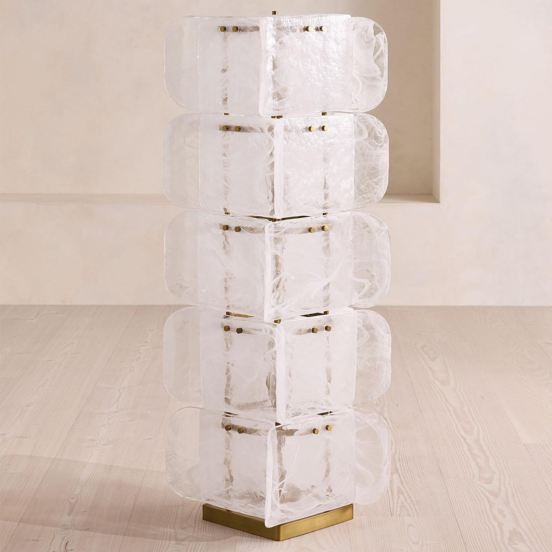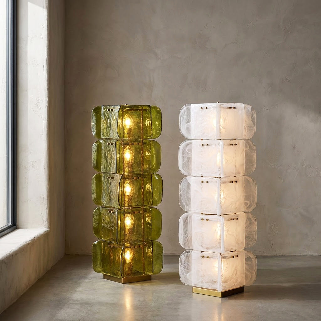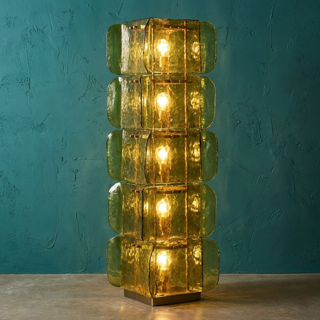 The Stacked Glass Floor Lamp features a vertical progression of layered glass sections that create a tall, elegant form with visual rhythm. Designed to stand beside sofas, in entryways, or within living areas, its stacked silhouette draws the eye upward and adds architectural interest without dominating the room’s overall design.