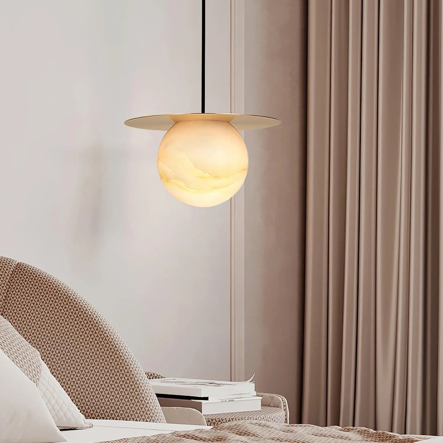 The Alabaster Sphere Bedroom Pendant Light features a blend of brass and an alabaster sphere shade. The G9 light is concealed within a lampshade made of milky alabaster. The light sits atop a golden disc, reflecting the stunning design of the lamp.