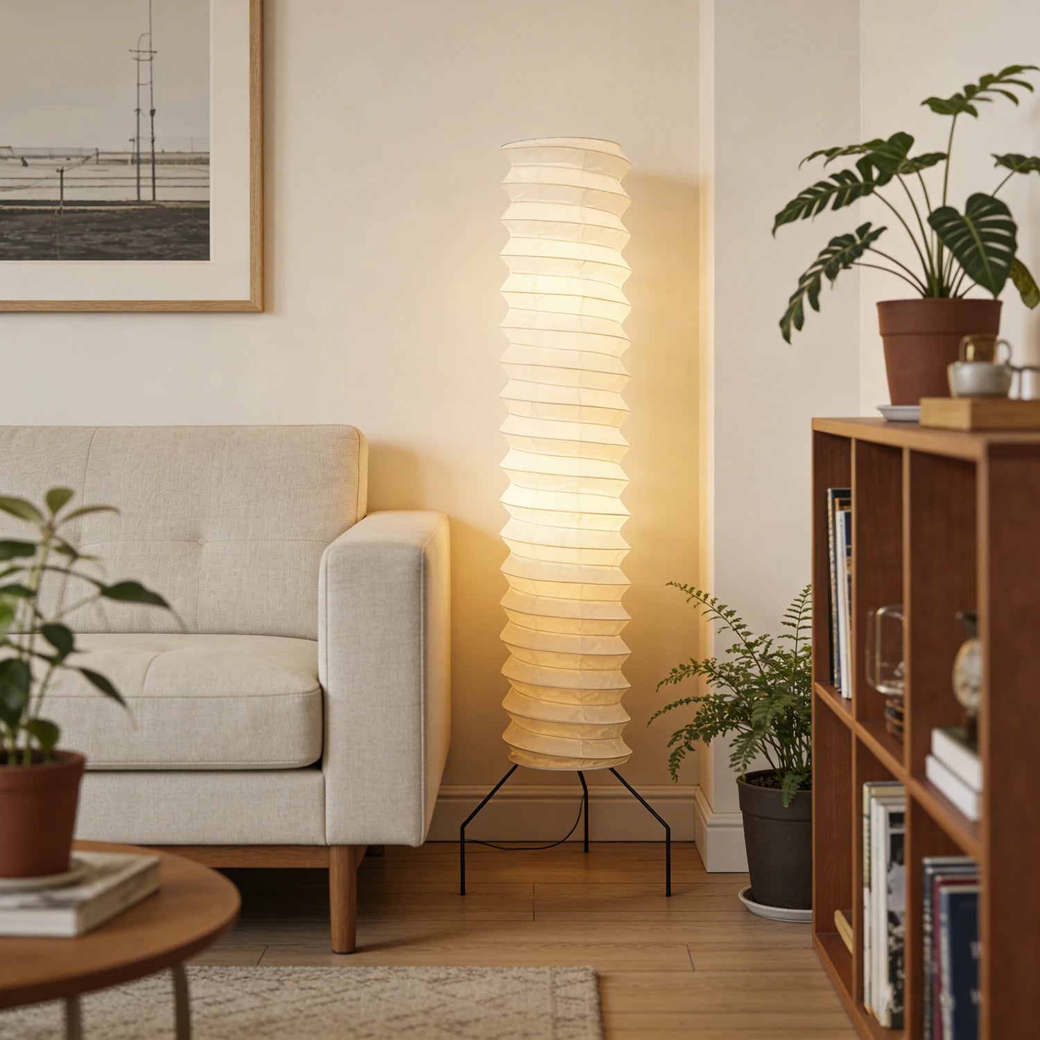 The Akari Spiral UF4-31N Floor Lamp is a luxurious and exquisite creation, its design embodying the delicate beauty of Japanese washi paper and the form of modern sculpture. It serves as an artistic focal point in living rooms, bedrooms, and studies, providing soft ambient lighting. Ideal for placement beside a sofa, bedside, or in an empty corner, this lamp offers a bright and airy aesthetic. The paper material ensures that the light is not harsh, making it perfect for creating a warm and relaxing home environment.