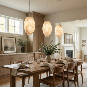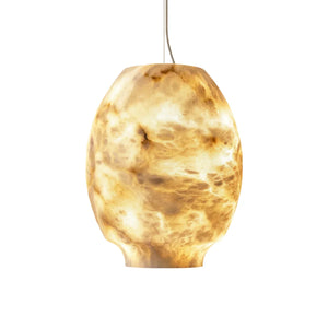 The Oval Camille Organic Alabaster Pendant Lamp is a masterpiece crafted for discerning dining spaces that demand exceptional aesthetics. It's not just a lamp, but a perfect symphony of art and nature.