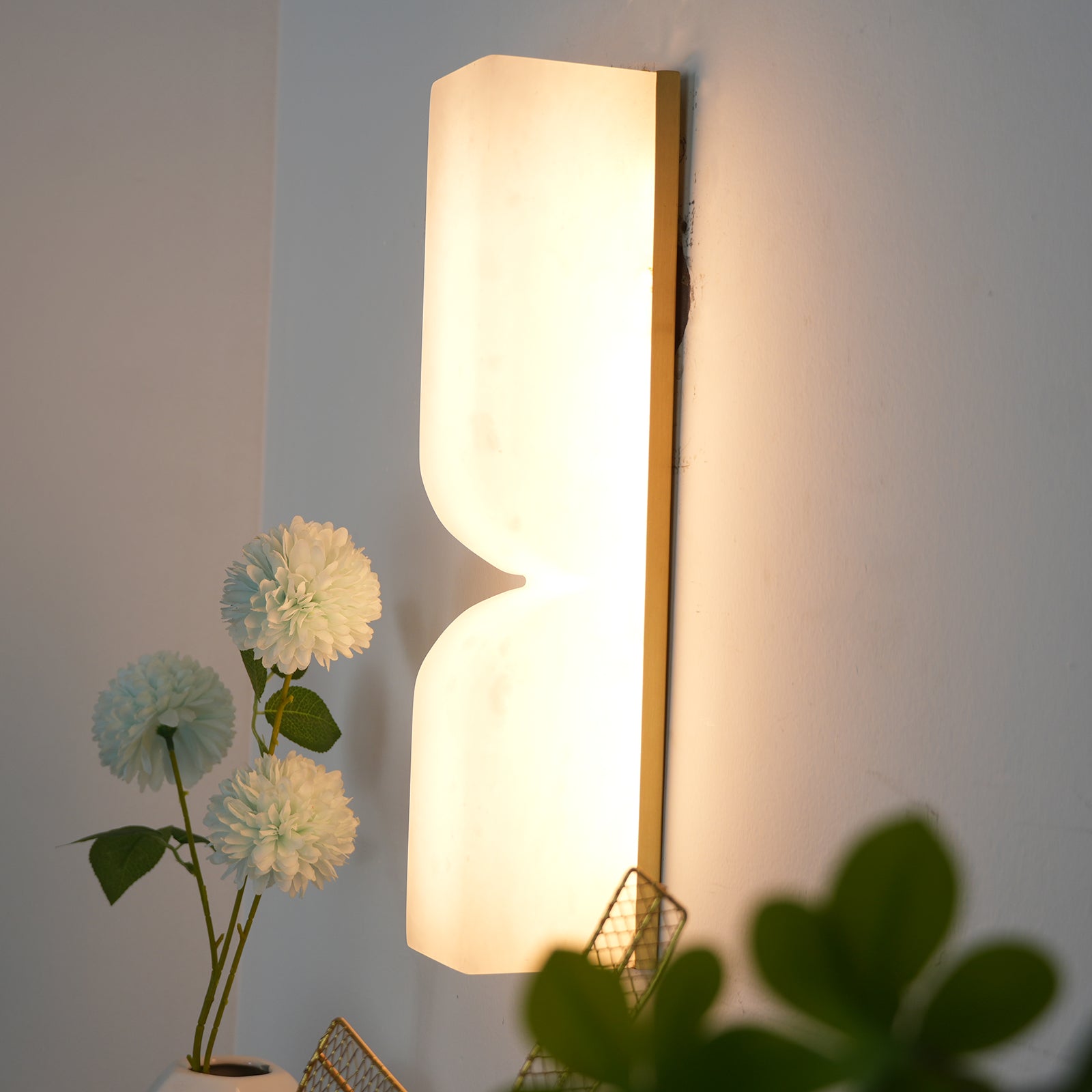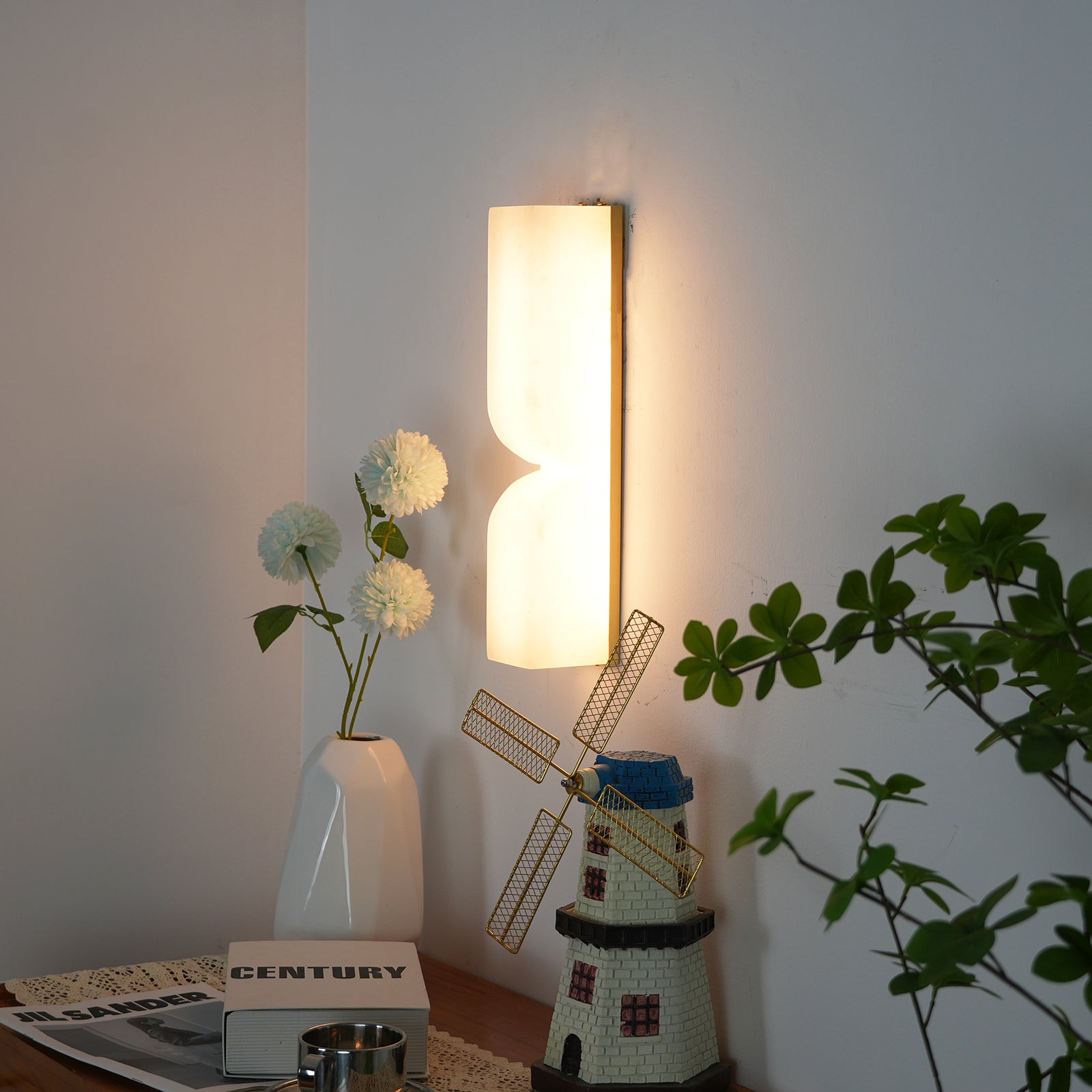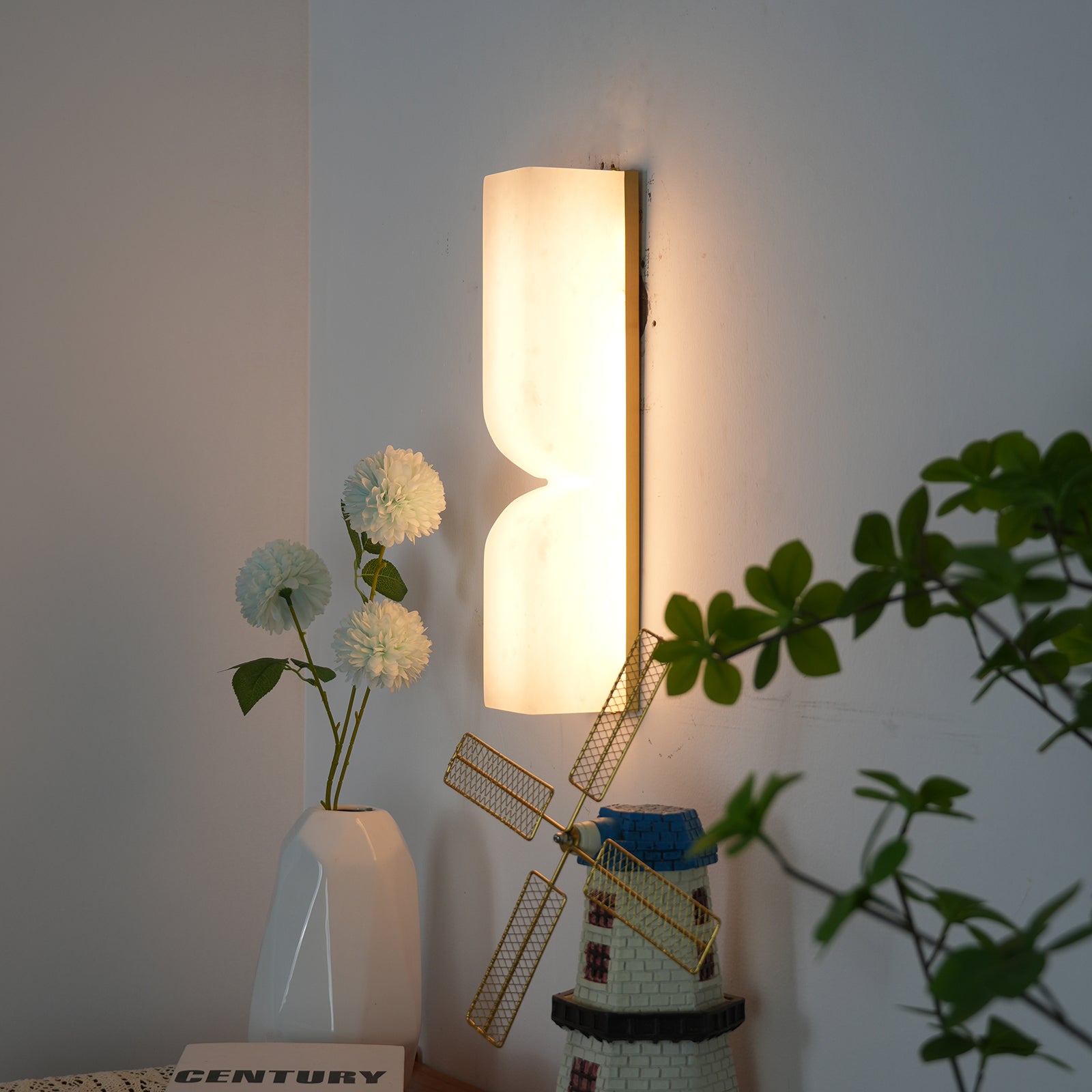 Crafted from natural alabaster, ensuring purity of material and a substantial feel, each lamp features a unique texture. This luxurious material makes it a functional wall sculpture. It features a refined rectangular geometric silhouette, incorporating soft, flowing double-curved lines. This design simulates the harmonious coexistence of two forms in motion, imbuing the stone with a rare sense of dynamism and vitality. When illuminated, the stone emits a soft, warm glow from within. This translucent effect deeply activates the unique natural textures of the alabaster, adding a profound sense of tranquility and artistic soul to the wall.