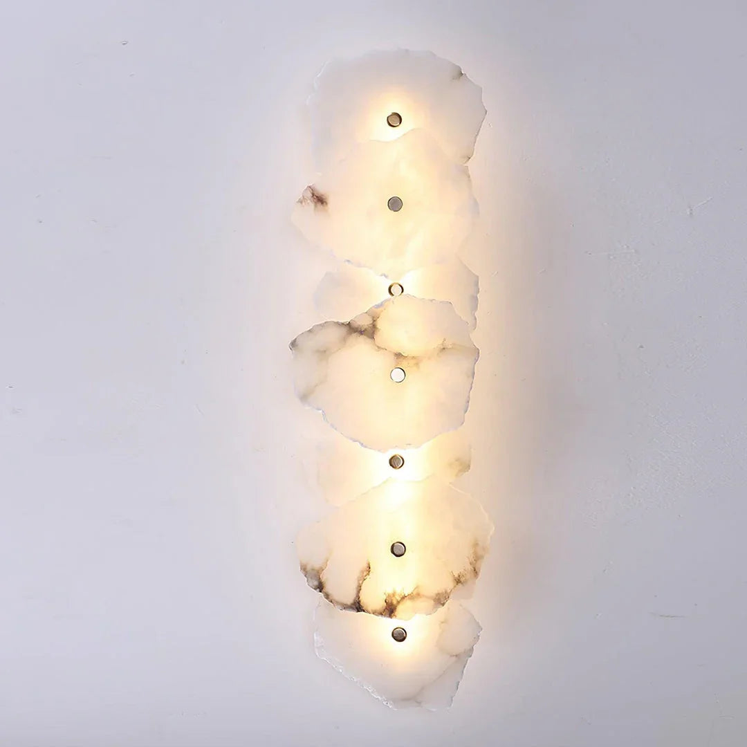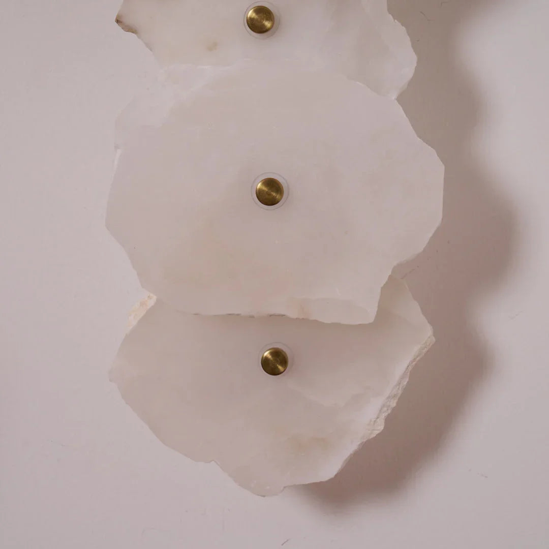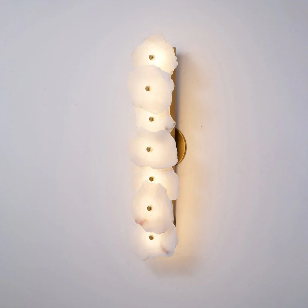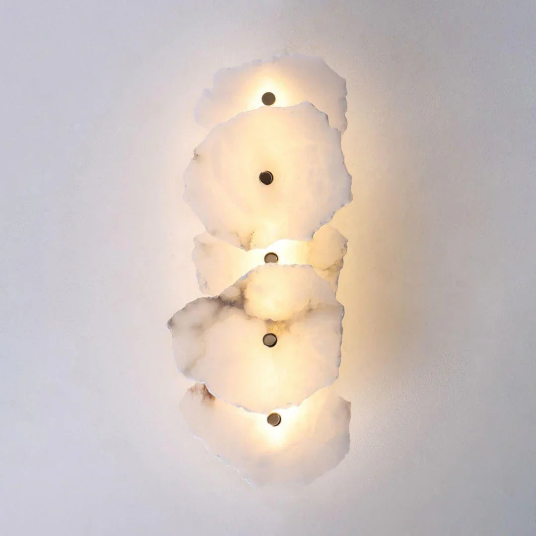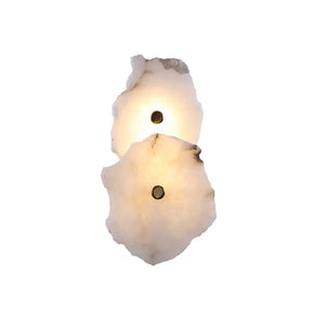 The Alabaster Petra irregular wall lamp is more than just a lighting fixture; it's a dazzling piece of wall art. It creates a warm and inviting atmosphere, with the translucent stone filtering soft, textured light that perfectly highlights the natural patterns within the mineral. Crafted from carefully selected natural translucent alabaster, each lamp possesses a unique natural texture and translucency. Whether used as minimalist hallway lighting, a luxurious bedside lamp in the bedroom, or as accent lighting on a living room feature wall, the Petra wall lamp adds a touch of refined elegance to any space.