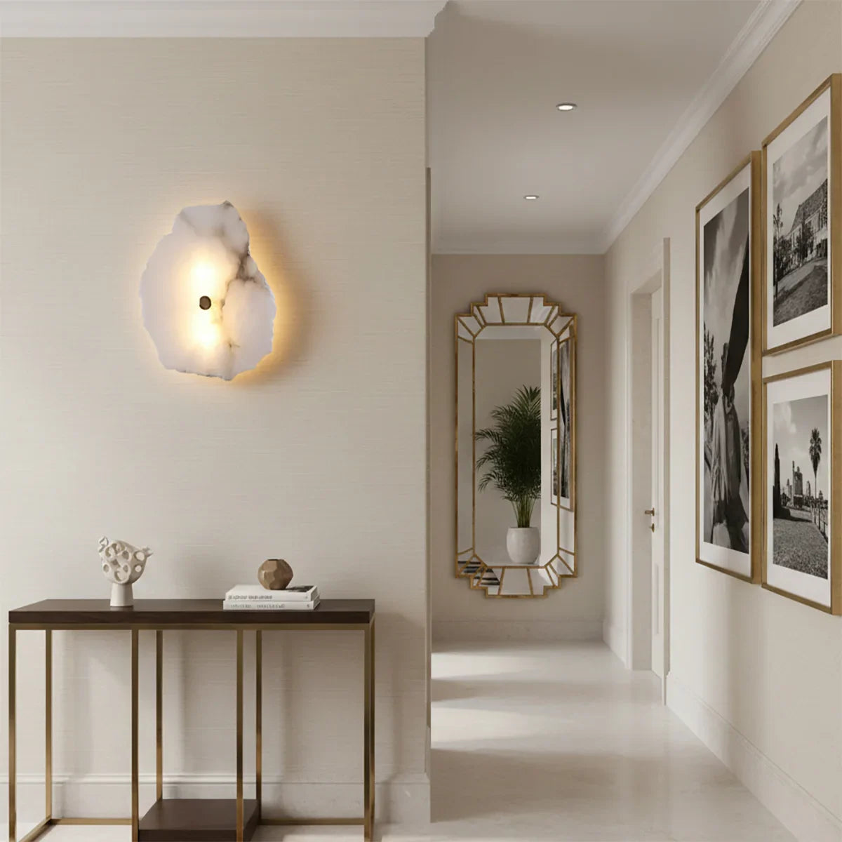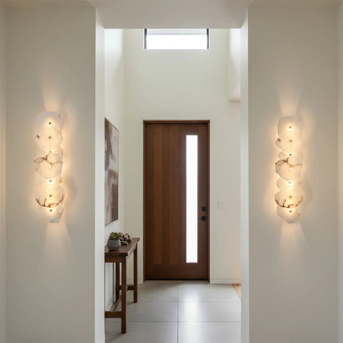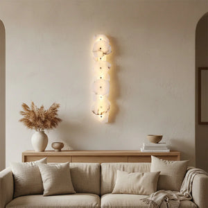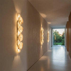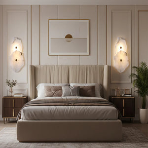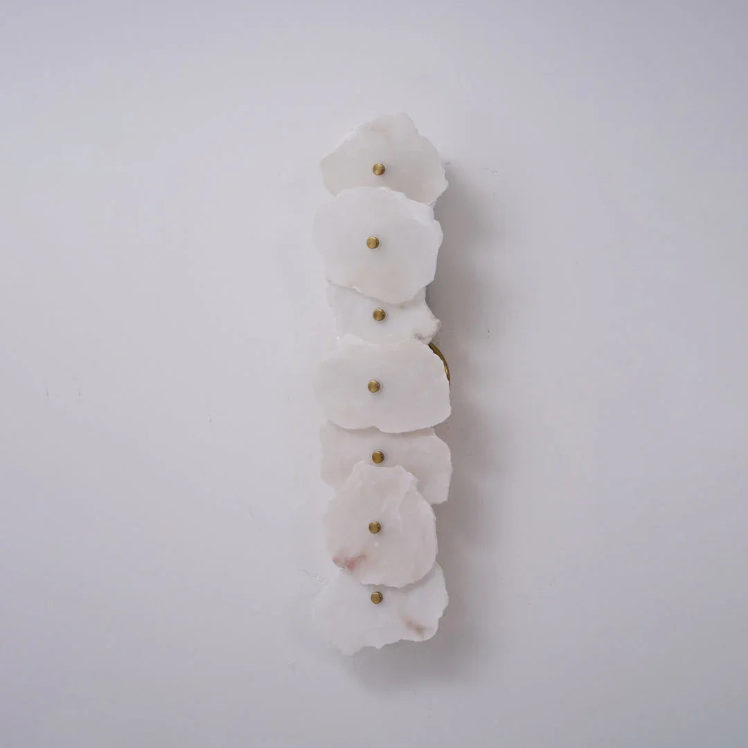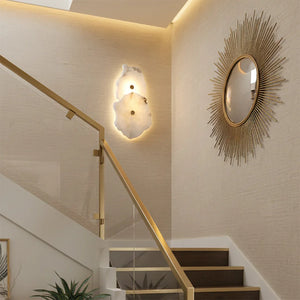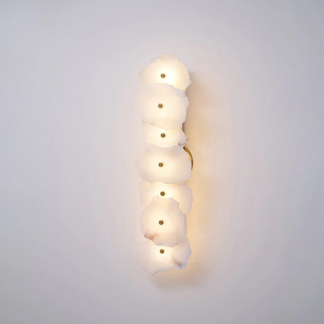 The Alabaster Petra irregular wall lamp is more than just a lighting fixture; it's a dazzling piece of wall art. It creates a warm and inviting atmosphere, with the translucent stone filtering soft, textured light that perfectly highlights the natural patterns within the mineral. Crafted from carefully selected natural translucent alabaster, each lamp possesses a unique natural texture and translucency. Whether used as minimalist hallway lighting, a luxurious bedside lamp in the bedroom, or as accent lighting on a living room feature wall, the Petra wall lamp adds a touch of refined elegance to any space.