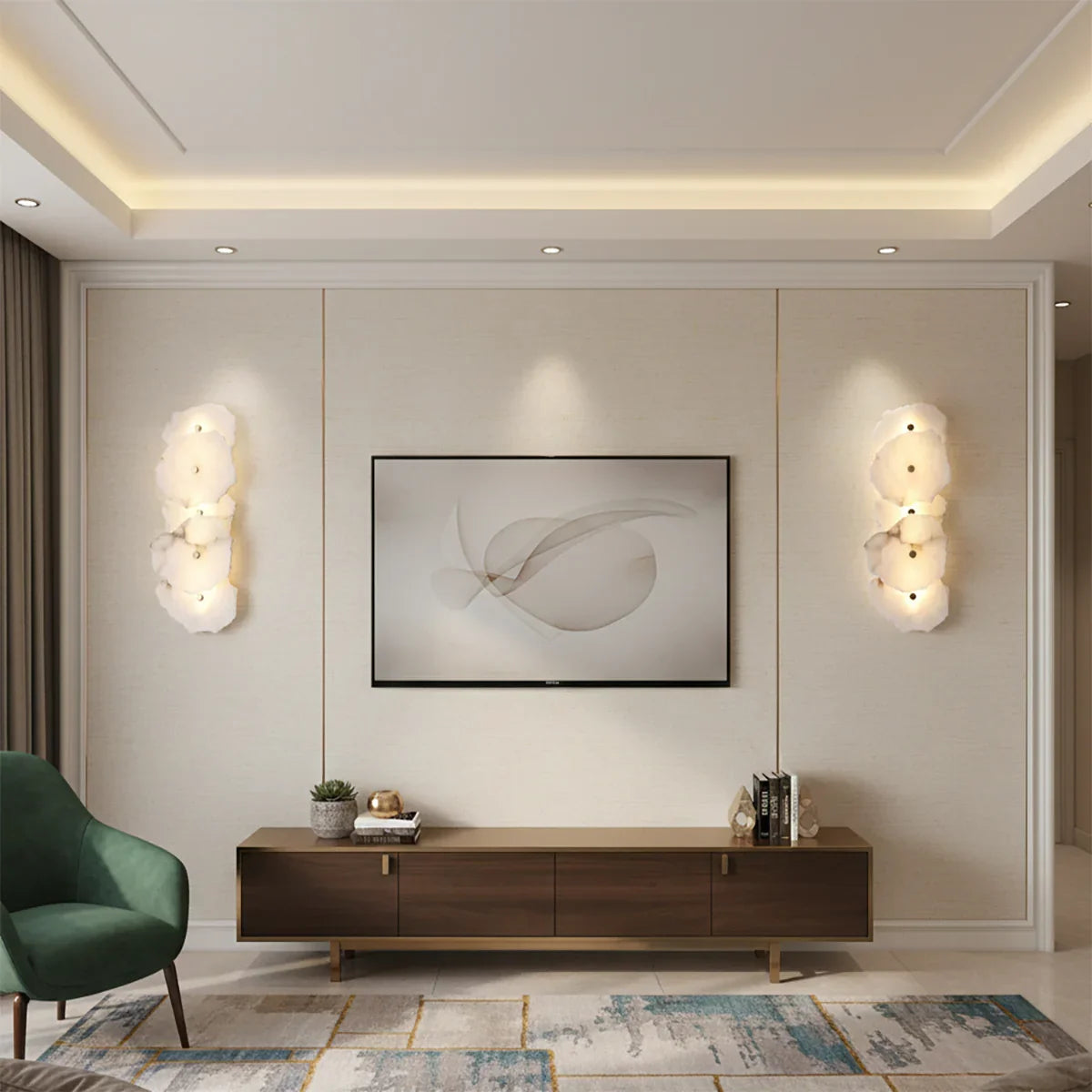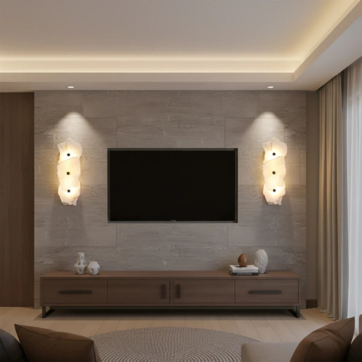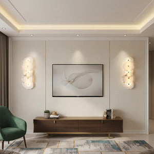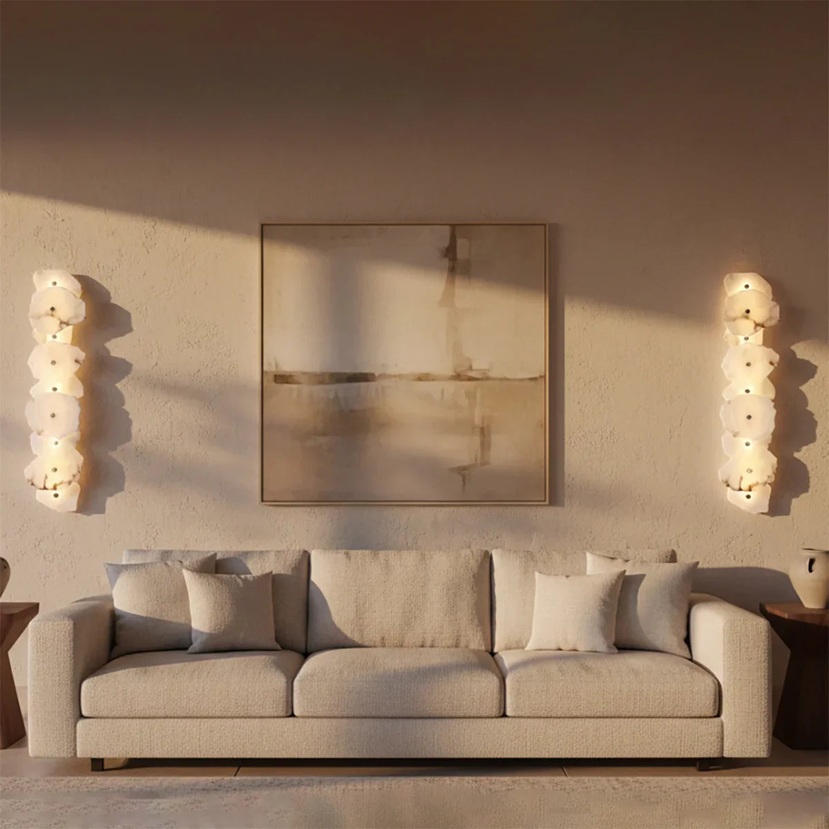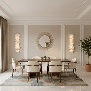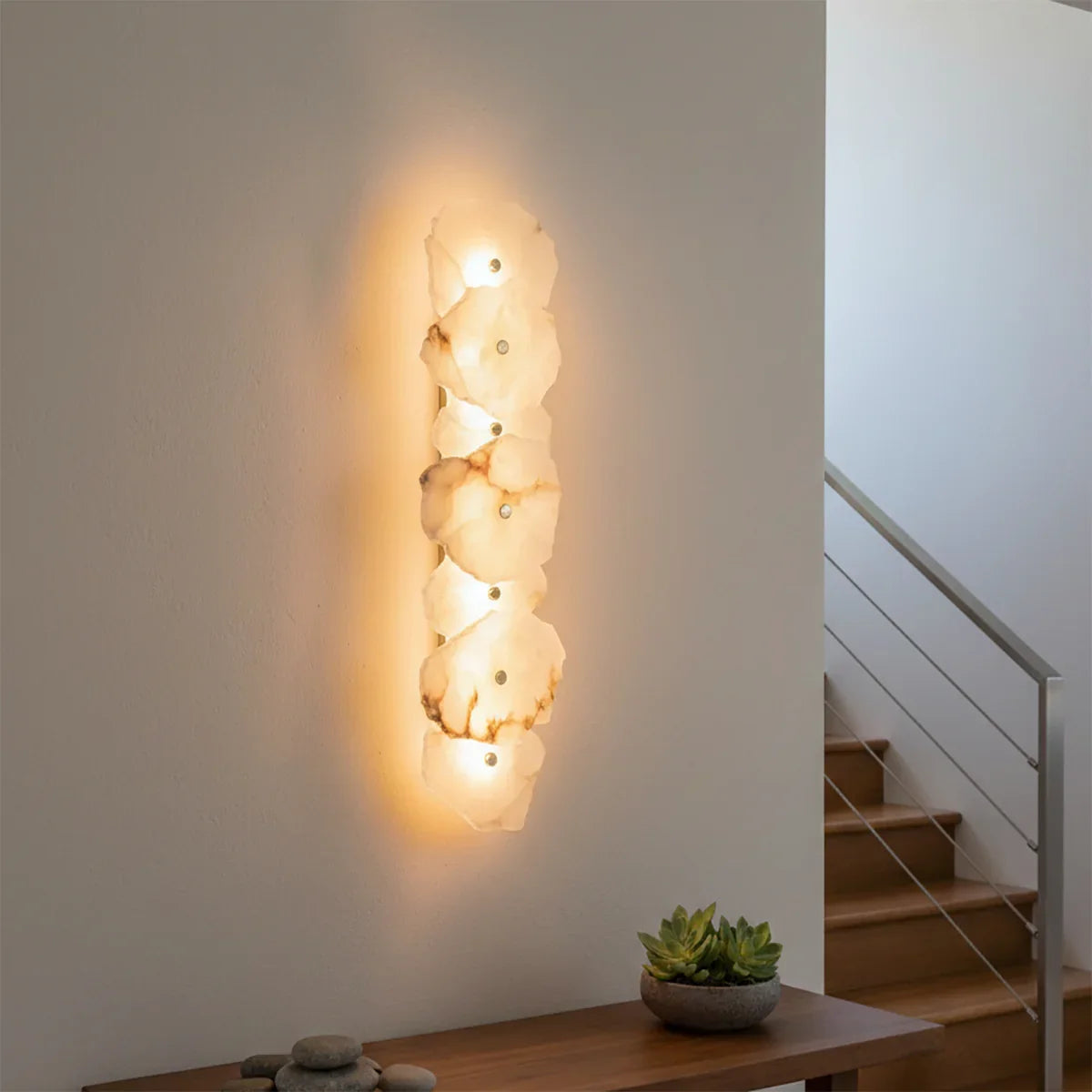 The Alabaster Petra irregular wall lamp is more than just a lighting fixture; it's a dazzling piece of wall art. It creates a warm and inviting atmosphere, with the translucent stone filtering soft, textured light that perfectly highlights the natural patterns within the mineral. Crafted from carefully selected natural translucent alabaster, each lamp possesses a unique natural texture and translucency. Whether used as minimalist hallway lighting, a luxurious bedside lamp in the bedroom, or as accent lighting on a living room feature wall, the Petra wall lamp adds a touch of refined elegance to any space.