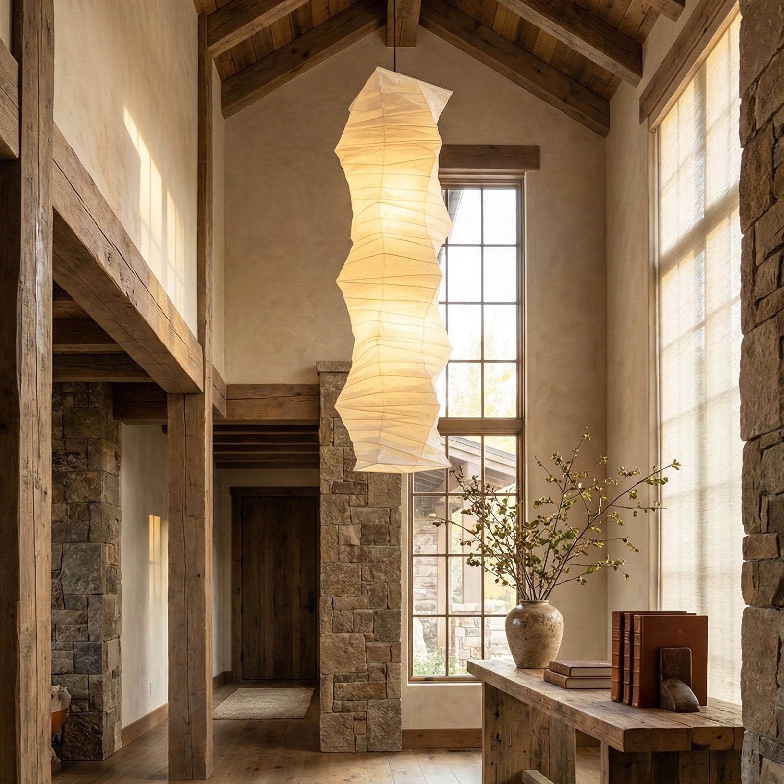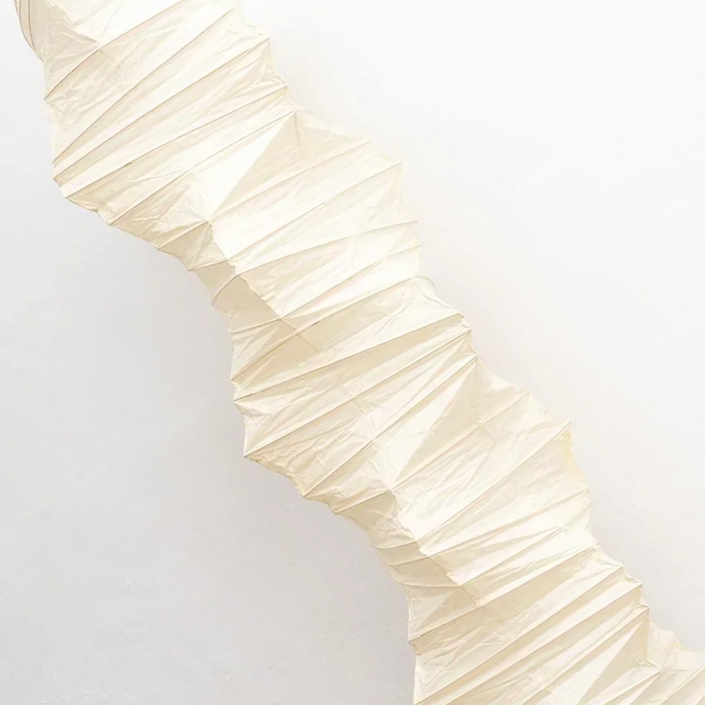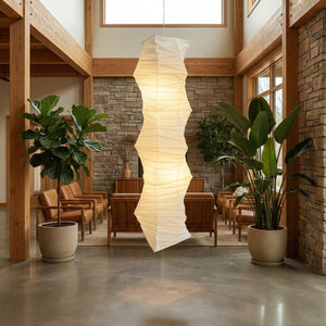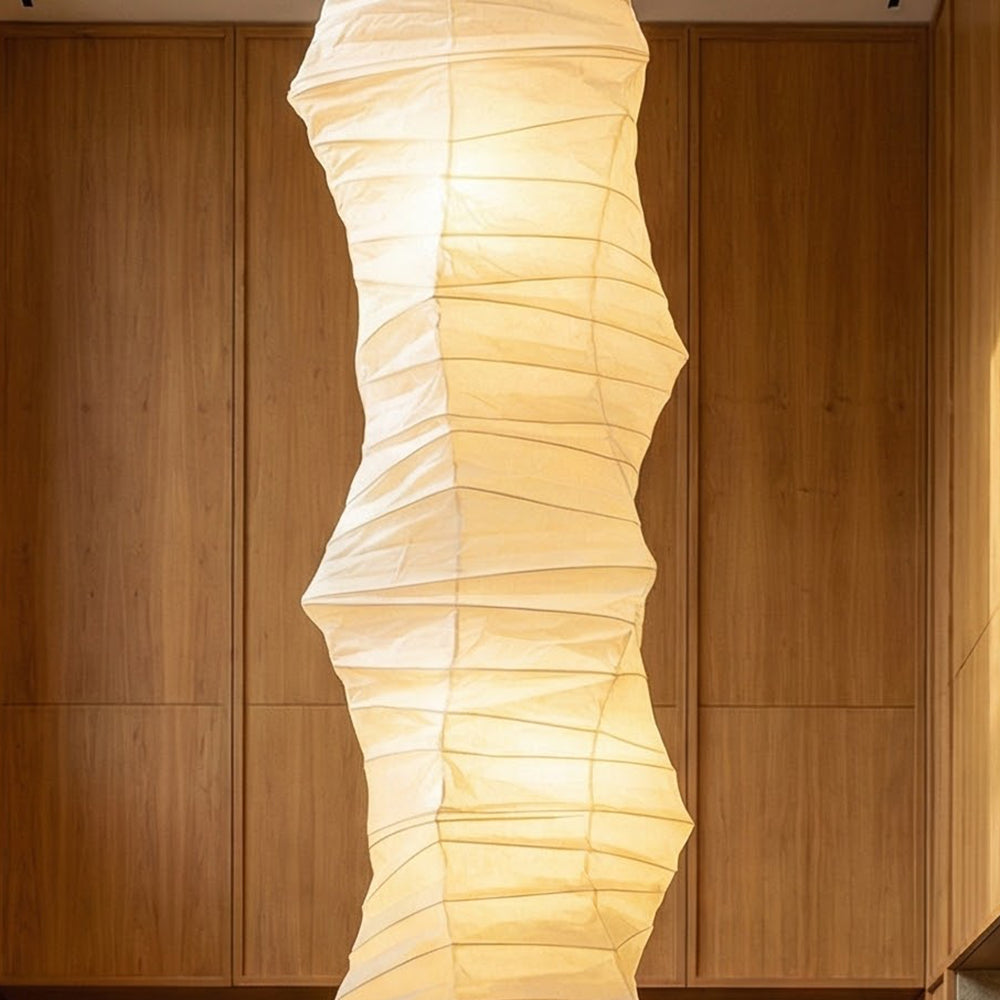 The Irregularly Twisted Paper 33N Pendant Light is a tall pendant lamp that perfectly combines traditional design inspiration with a modern, sculptural aesthetic. It's ideal for high ceilings, stairwells, or atriums in duplex apartments, and also serves as a main or decorative lighting fixture in large living rooms or hotel lobbies. It caters to those seeking a Zen-like, natural feel and a tranquil atmosphere.