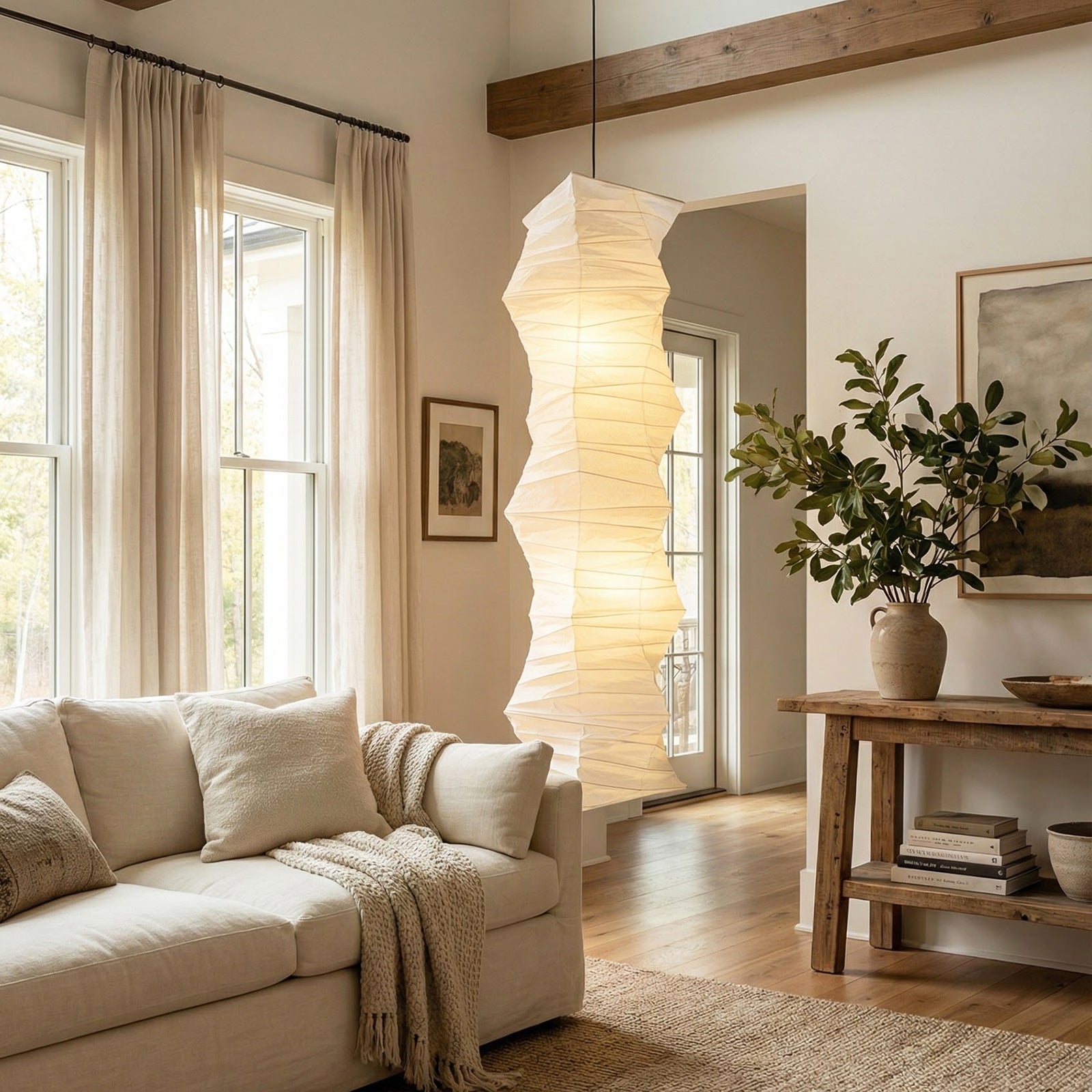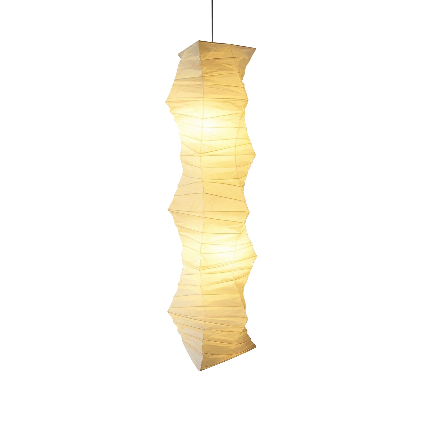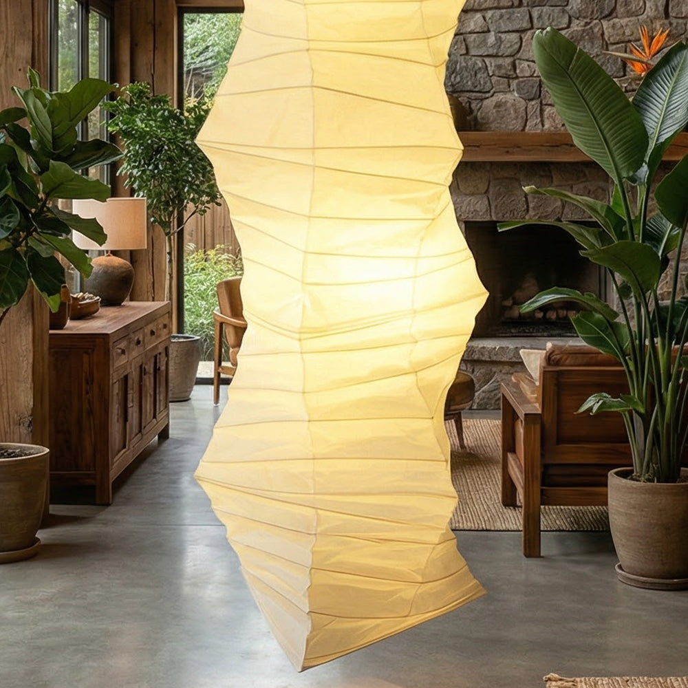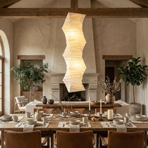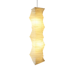 The lamp's body features a unique, irregularly twisted or Z-shaped folded segmented design, giving it a powerful dynamic sculptural presence in the vertical direction. This form imbues it with stunning visual depth and effortless elegance. Crafted from high-quality paper, this material emits a warm, luxurious diffused light. This elegant pendant light perfectly blends aesthetic and cultural influences, making it an ideal choice for Japanese, Wabi-Sabi, and Nordic minimalist homes.