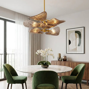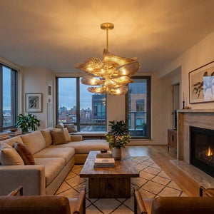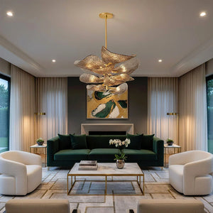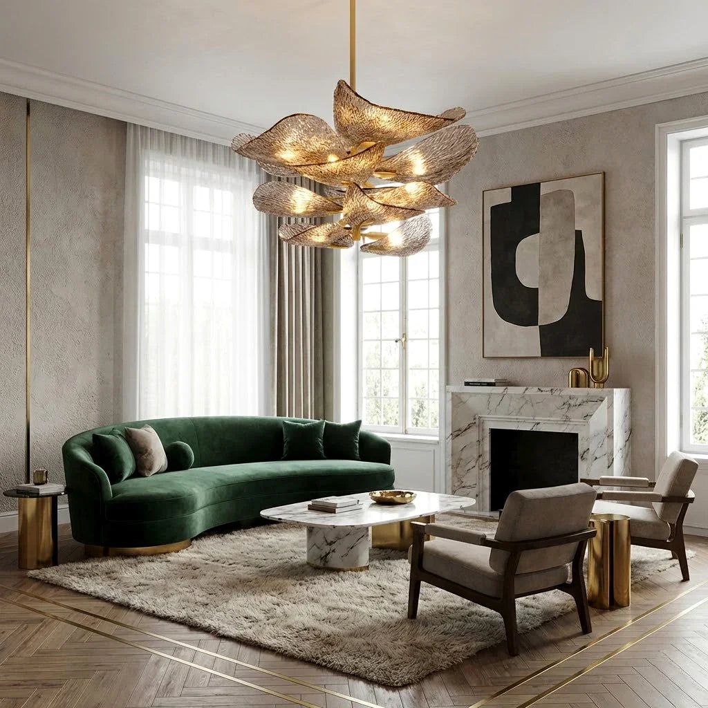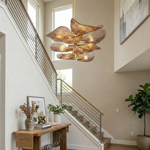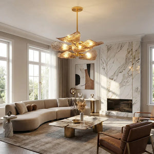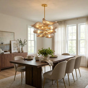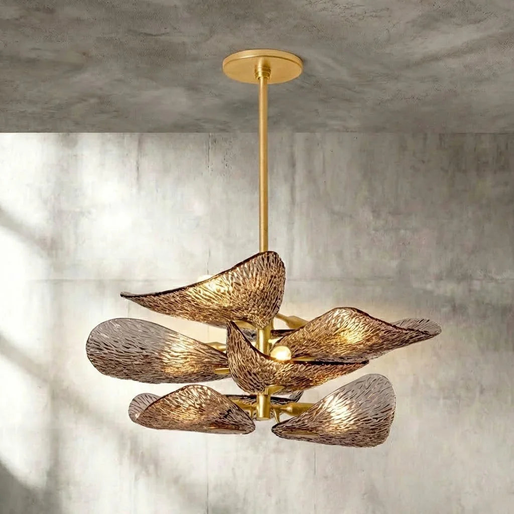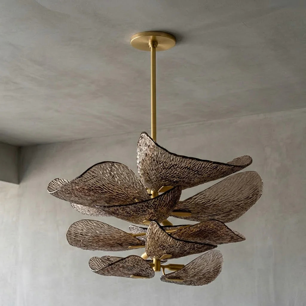 The Textured Glass Leaf Chandelier features an organic arrangement of textured glass elements shaped like overlapping leaves, bringing a natural yet refined presence to entryways, dining rooms, or high-ceiling living spaces. Its sculptural form creates visual rhythm and movement without dominating the surrounding décor.