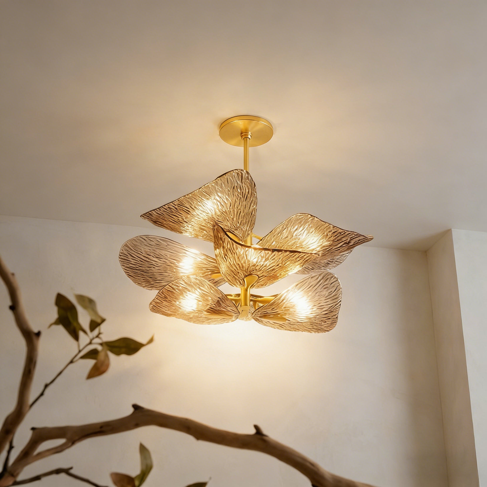 Each textured glass “leaf” captures and diffuses light with soft variation, introducing depth and a luminous quality that enhances the atmosphere with subtle complexity. The interplay of light and surface enriches the space through tactile expression and ambient glow rather than decorative excess.